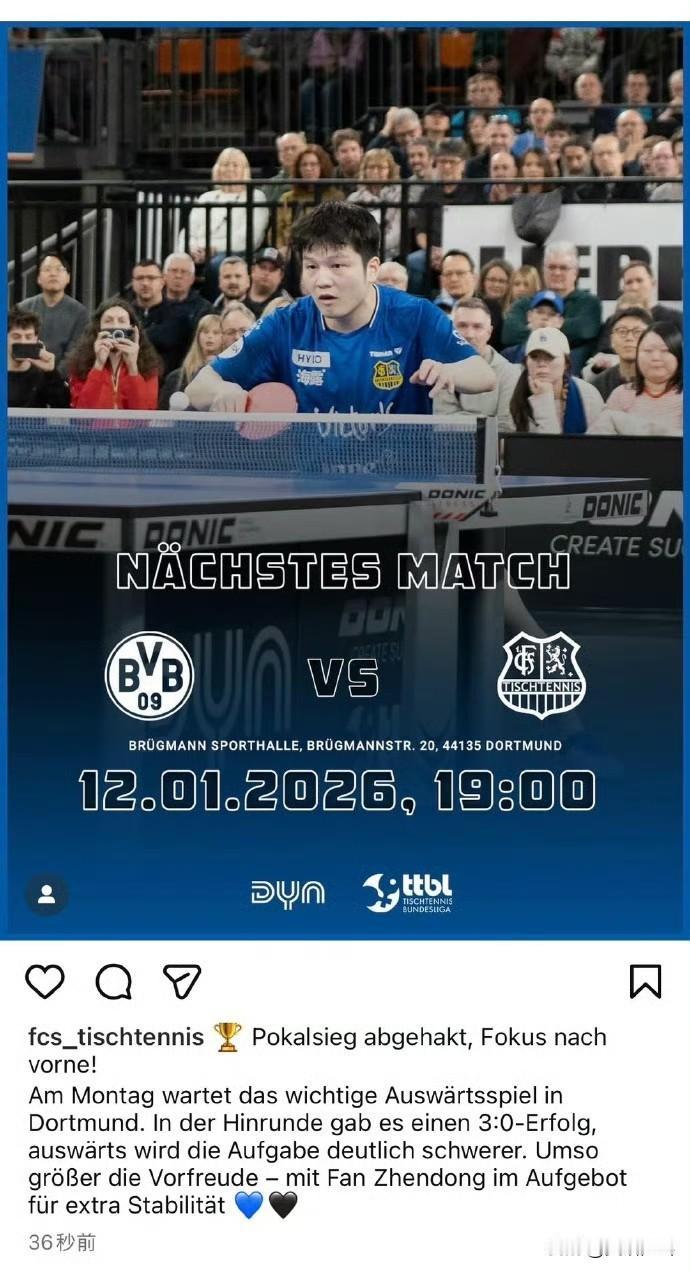 周一,一场关键的客场对决将在多特蒙德打响。首回合我们曾以3:0完胜对手,这次客场作战变得更加困难。期待值也因此拉满——阵中坐拥樊振东,为球队注入更强劲的稳定性! 2026.1.9