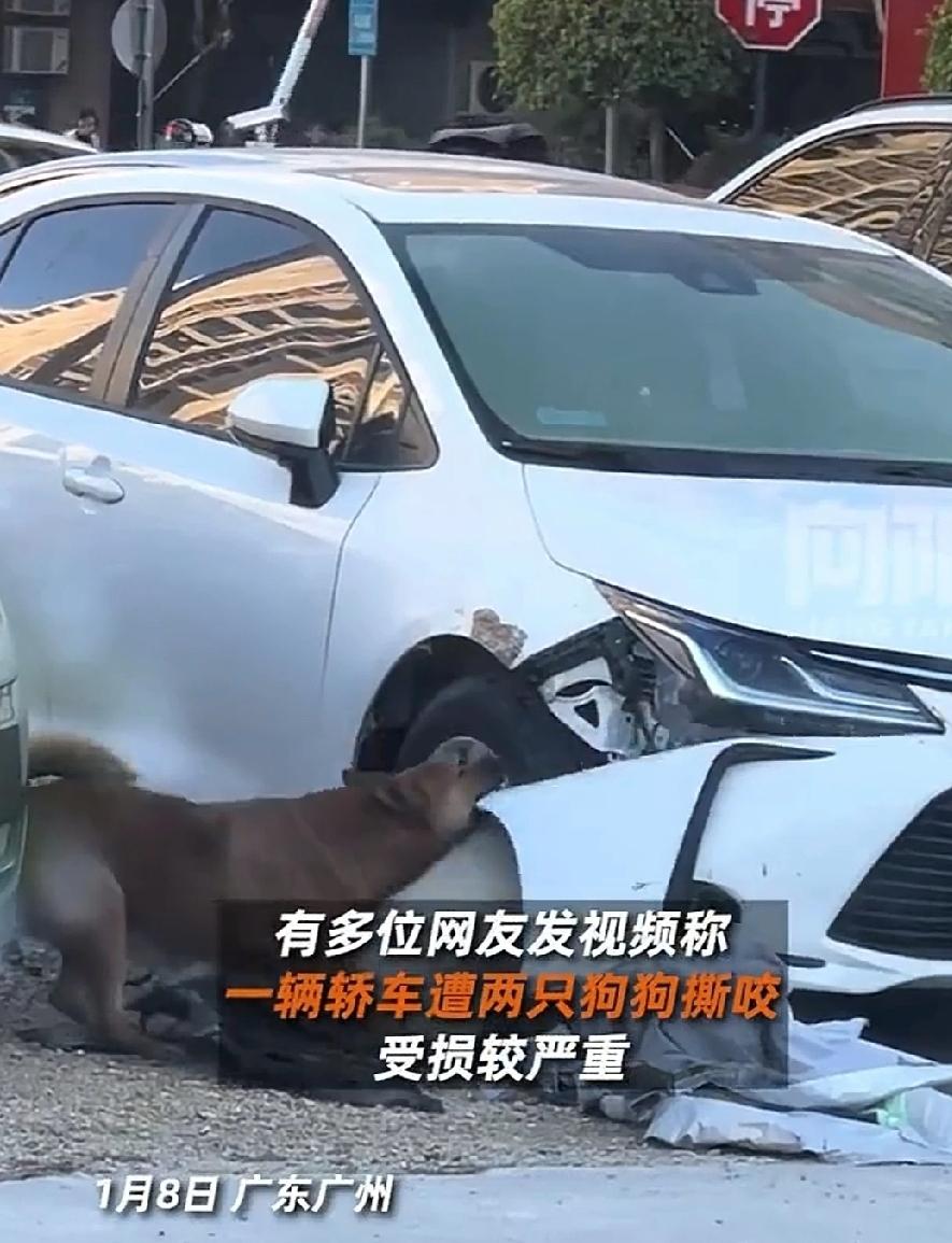 狗狗不仅会拆家,还会拆车。 1月8日,广东广州。车主驾驶一辆白色轿车进入小区,遇到了两只狗狗,躺在路中间挡道。车过不去,便按了几声喇叭。狗狗猛然惊醒,悻悻离开。车过去后,车主停下车后离开。 待车主返回,看到车已是面目全非。车杠、叶子板和线路都有损伤。有人看到,两条狗狗疯狂的撕咬车辆。 车主为此花费了约2000块钱维修。保险公司回应,先找到狗主人。如果找不到也会理赔。 狗狗的报复性很强,惊了它一下,就把车给拆了。看来狗狗拆家,也得重新找原因。很有可能就是主人把狗放在家里,不带它玩,故而产生怨恨,就报复主人,把家给拆了。 车主鸣笛驱赶拦路狗 结果车被狗拆了动物的迷惑行为