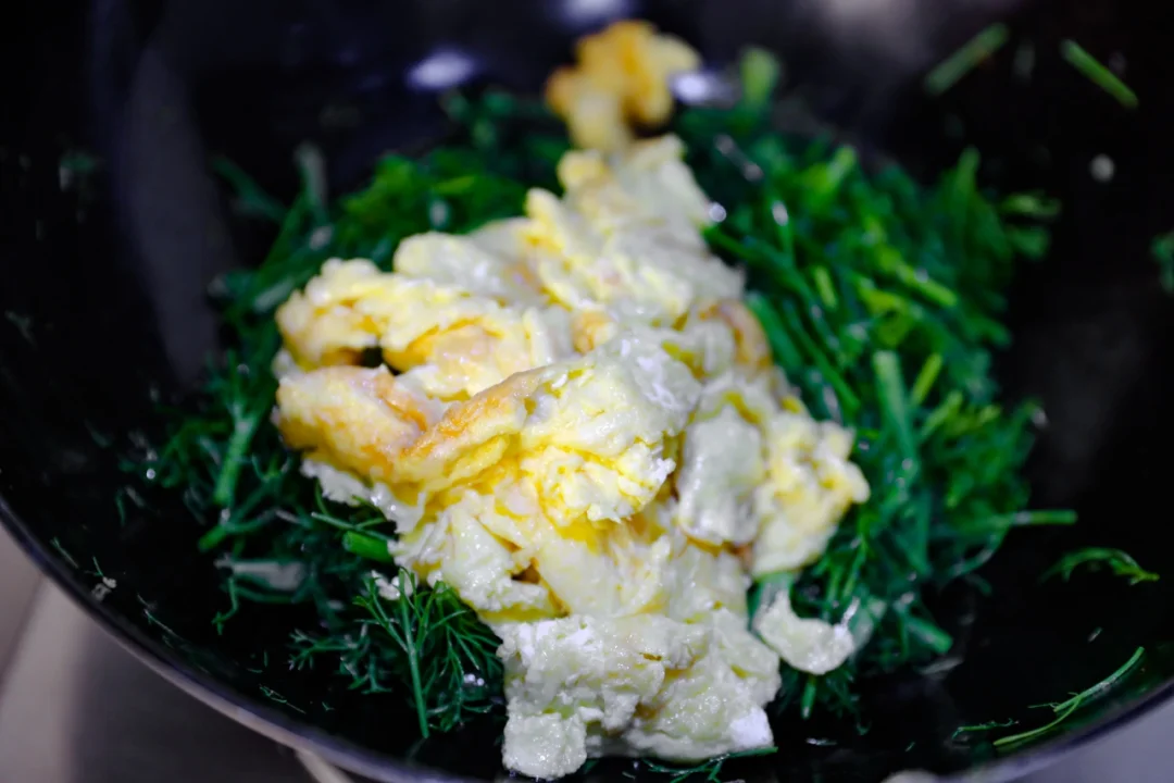 🌟3.再次放入少许底油,葱末炒出香味,放入茴香段,翻炒均匀之后加入炒好的鸡蛋,再加入适量的清水,加入食盐和生抽调味。