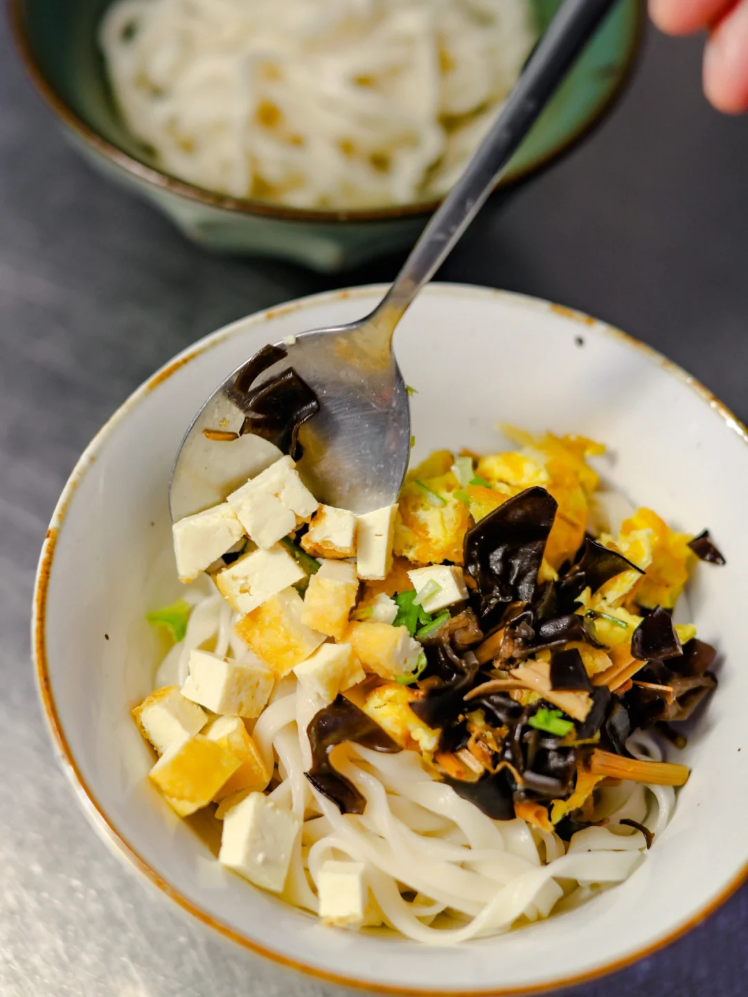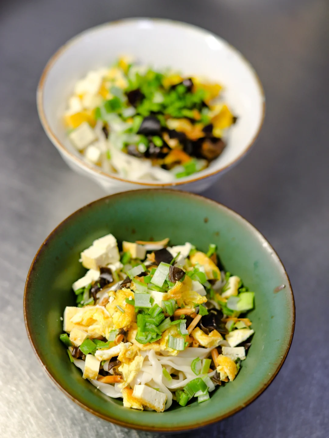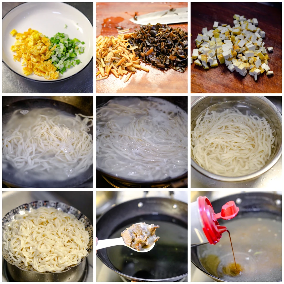 3.准备一些素臊子(木耳和黄花菜汆烫熟,鸡蛋皮,油豆腐丁和葱花)