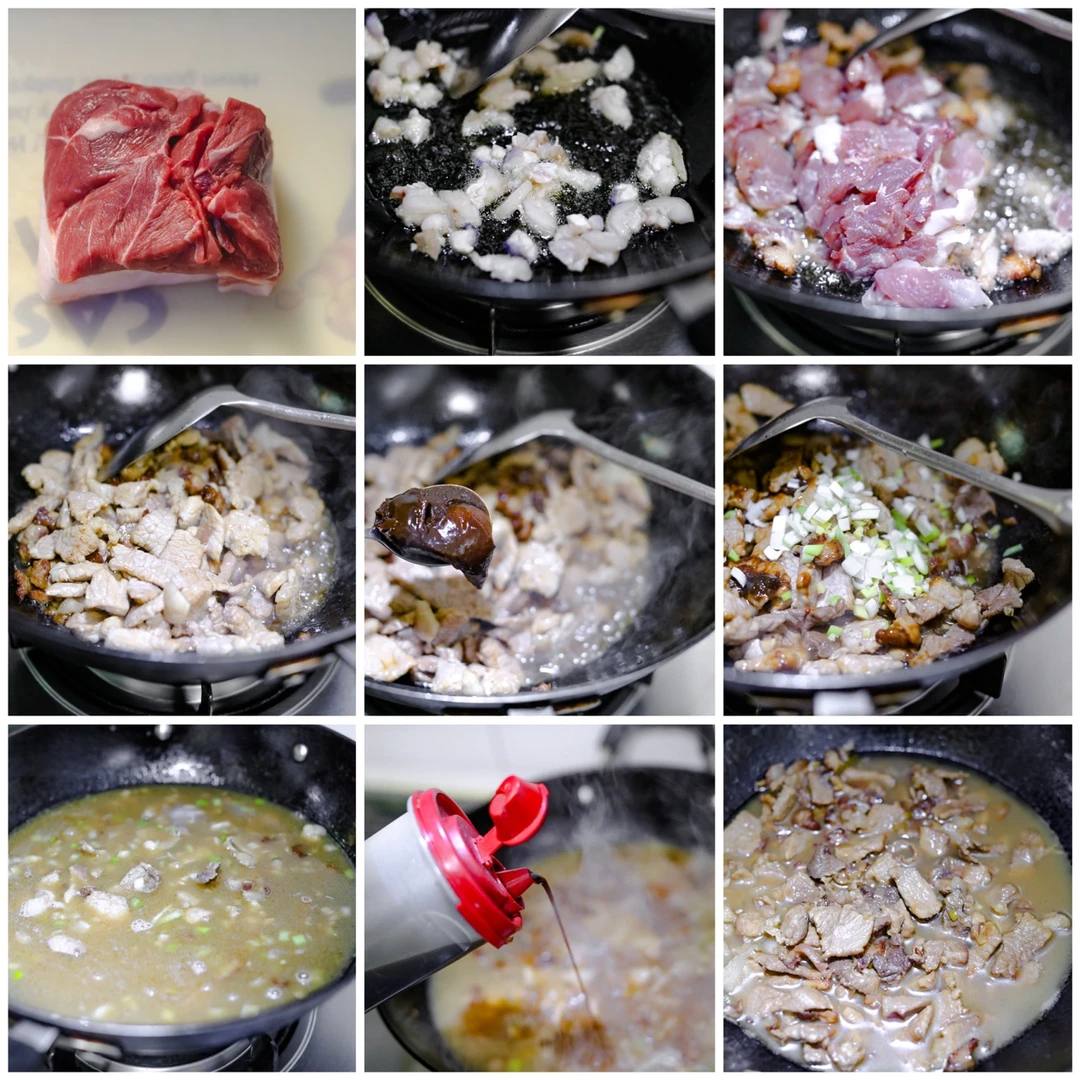 2.锅内多加一些油,加入肥肉炒出油,加入瘦肉,变色的时候加入黄酒去腥,加入葱姜和一些豆瓣酱炒匀(因为家里有宝宝,此处放的是不辣的豆瓣酱),如果没有忌口的,一定要放辣豆瓣酱,炒出红油之后,加入老抽,生抽,加入桂皮,八角,香叶,去籽的草果,炒香之后加入开水,加入适当的食盐,改小火,炖熟即可。