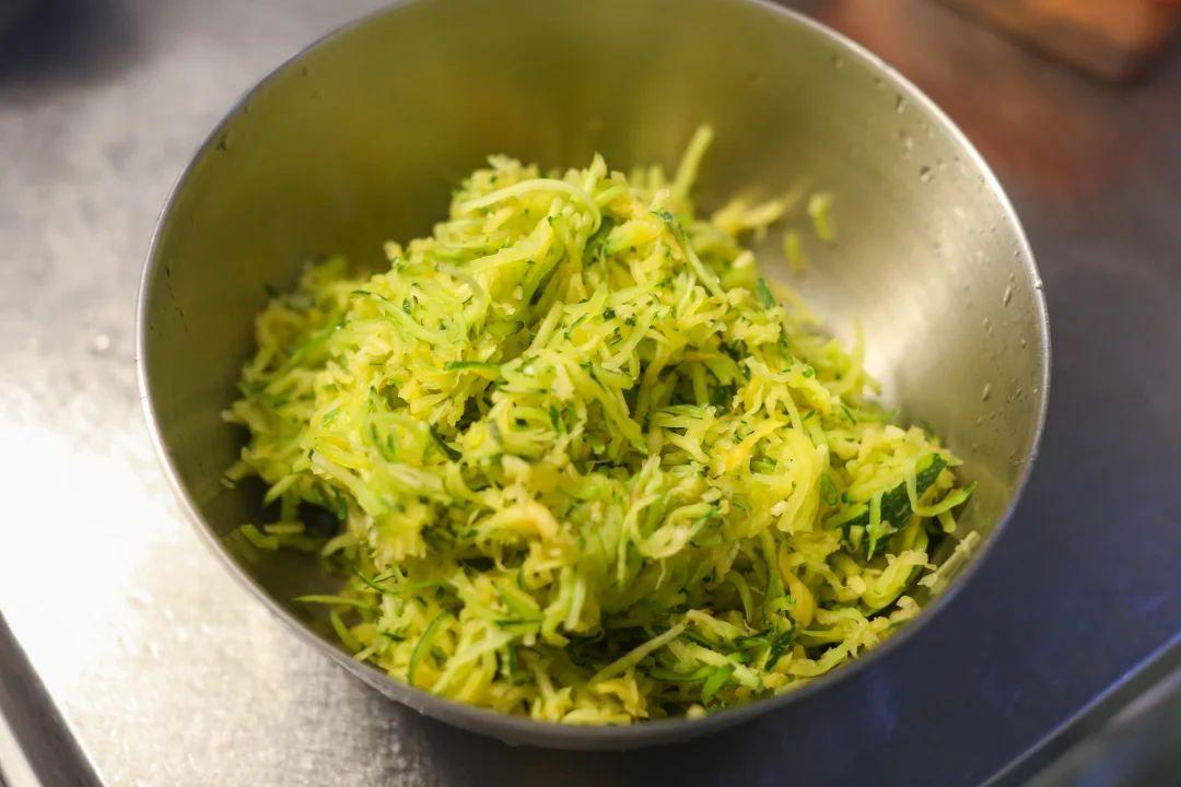 3:加入食盐适量,静置10分钟,把北瓜里面的水分杀掉,挤出多余的水分,剁成颗粒状。