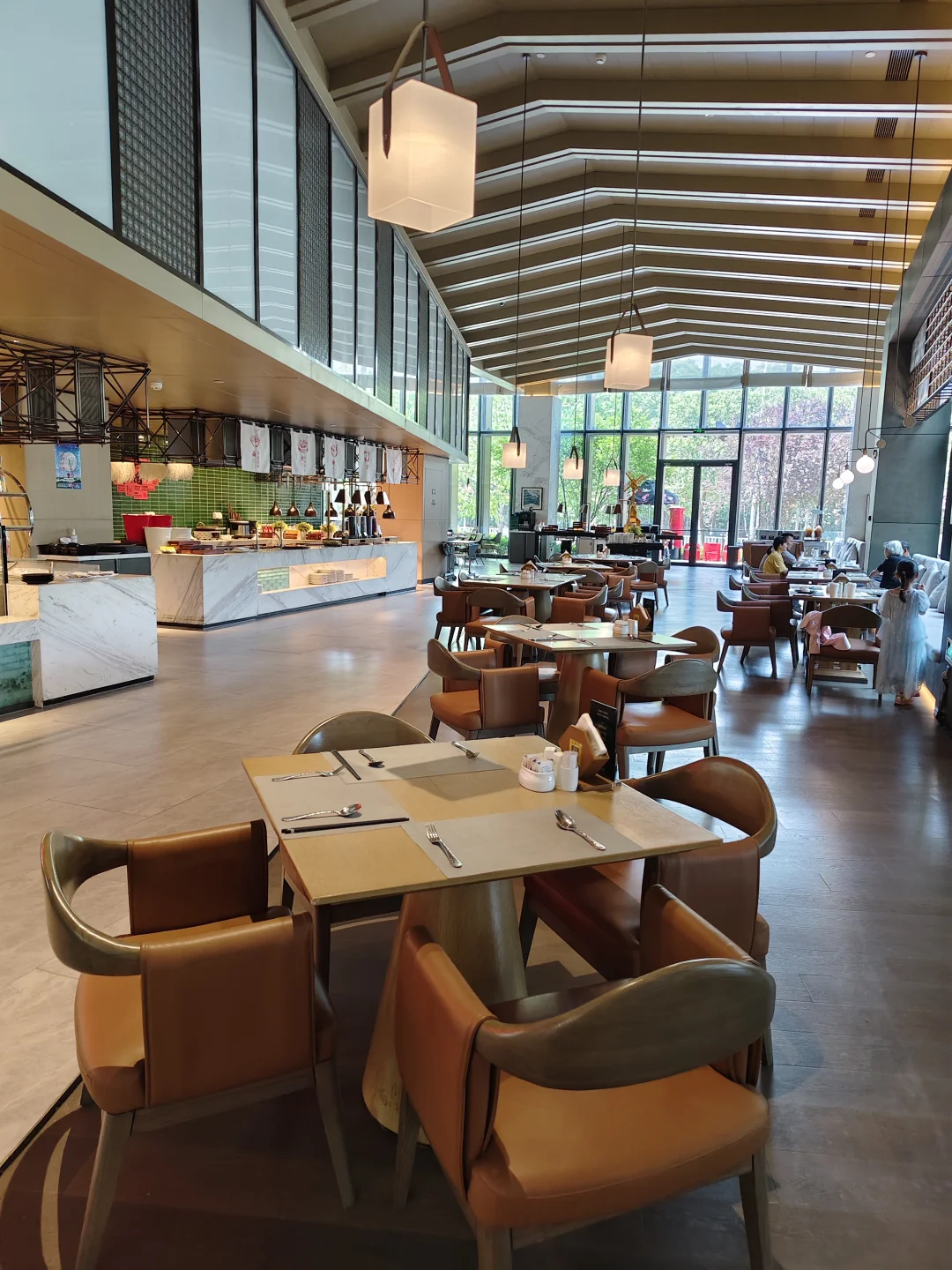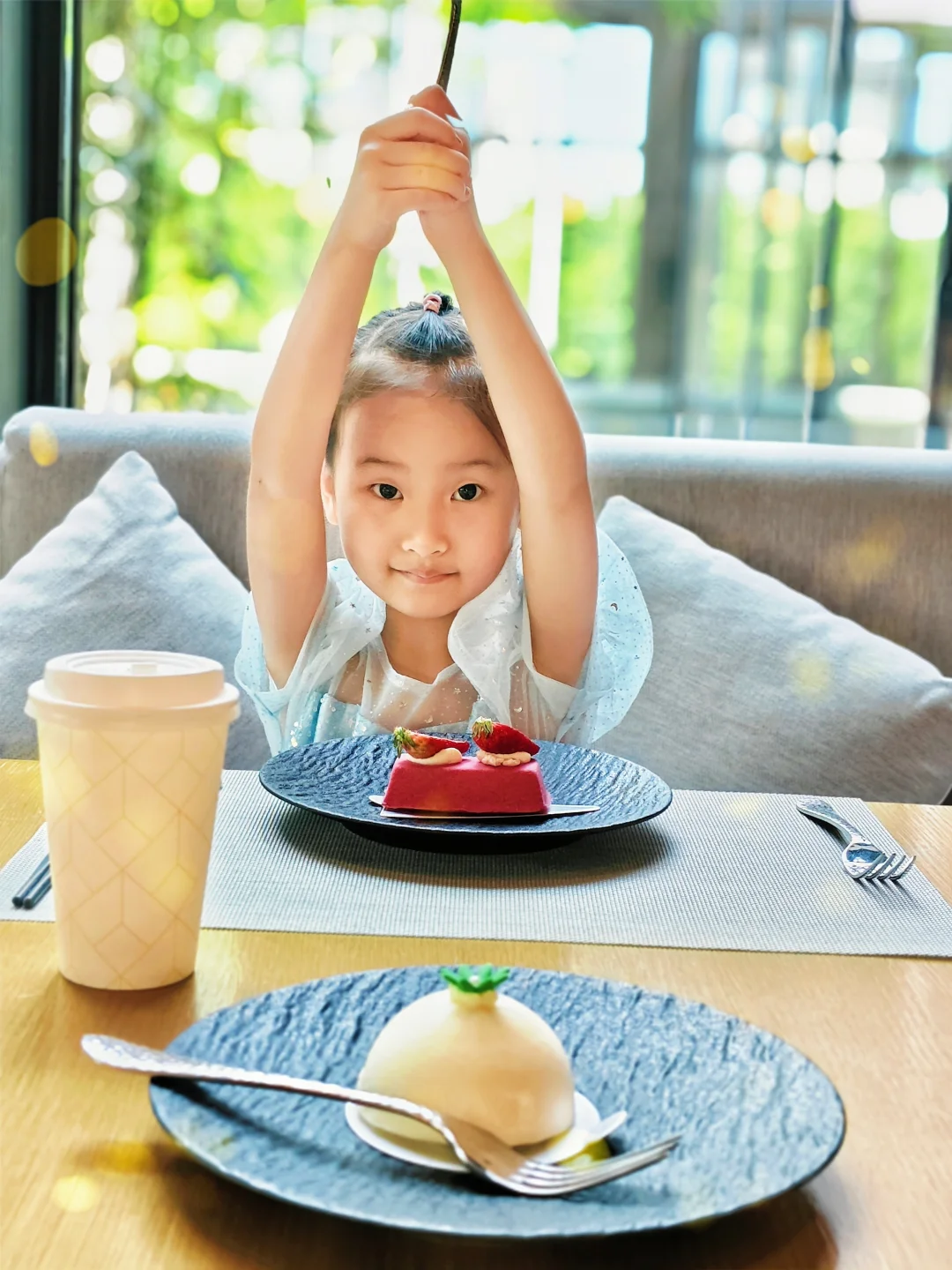 下午我们品尝了小红帽咖啡的甜品,好好吃,不会齁甜,酸甜可口。果茶小朋友也适合,口味纯正。晚餐主厨甄选的中式双人晚餐,敲丰盛,牛排、乳鸽、鱼虾、果盘、甜品,都很好吃。第二天自助早餐,中西结合,还有南京特色的鸭血粉丝、盐水鸭等,小丸子吃的肚子圆滚滚。