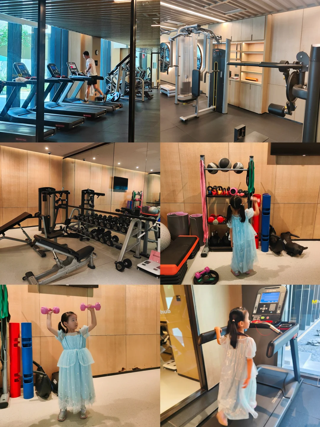 酒店健身房是24小时开放的,各种专业器械真的很全,小丸子双手各拿一个5kg哑铃高高举过头顶,老母亲赶紧抓拍,小丸子兴奋得很,还玩了一会跑步机。