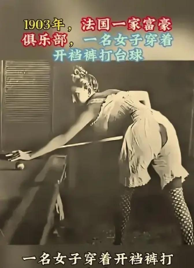 1903年巴黎贵妇在私人台球室穿开裆衬裤挥杆的照片被翻出来。 上流沙龙里,她们把原本如厕用的分腿内裤故意露出来,配着弯腰击球的动作,成了贵族圈里的时髦挑衅。 摄影师偷偷记录,画面里男人端着酒围观,女人却像在演一场精心编排的越界秀。 这不是日常穿搭,而是把身体当道具,用看似放荡的装扮加固阶级围墙。 历史翻旧账,越花哨越脆弱。