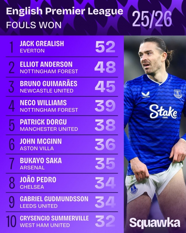 直播吧1月10日讯数据机构squawka统计了本赛季英超的造犯规情况,格拉利什居首。