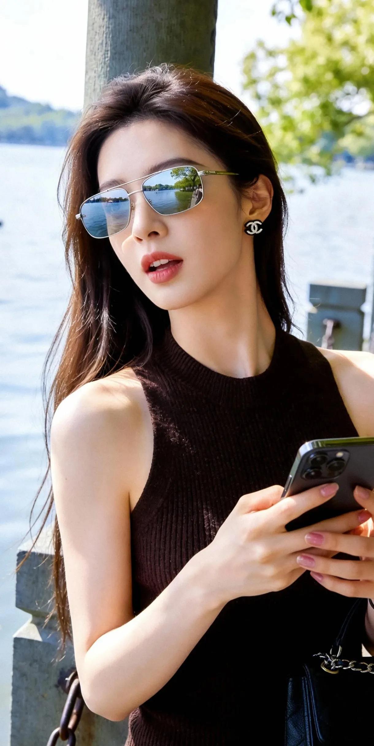 夏日湖畔,阳光明媚,时尚女孩手持手机,享受美好时光。