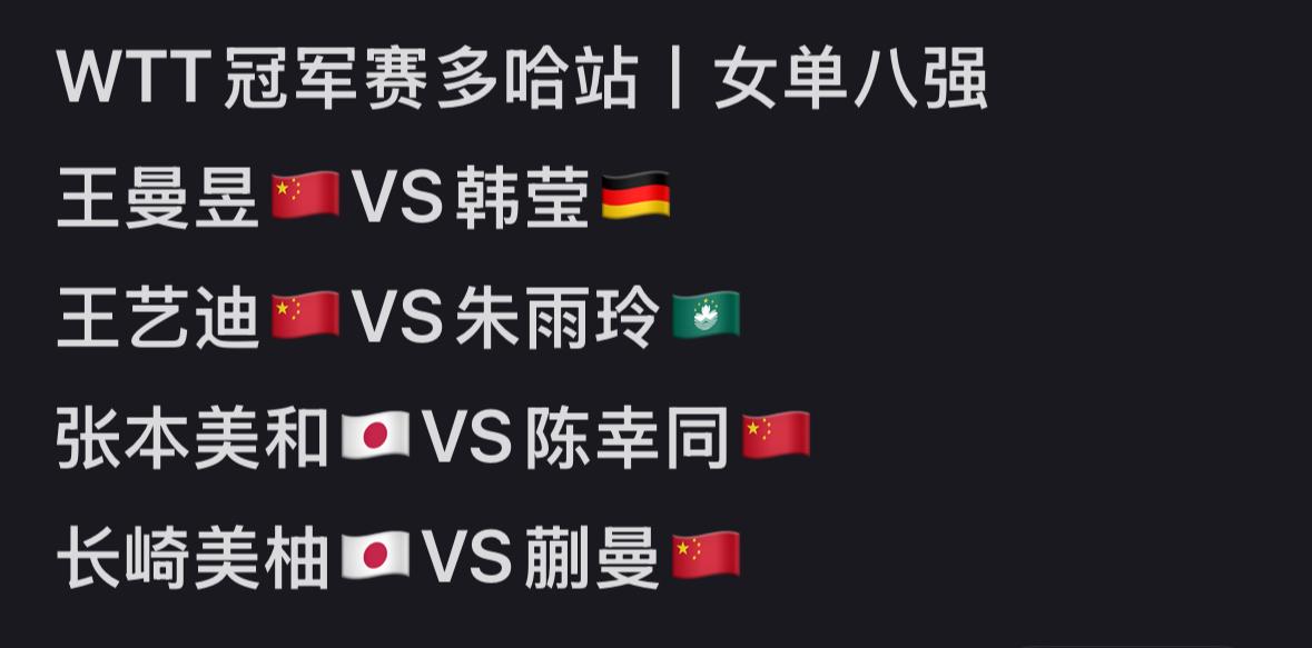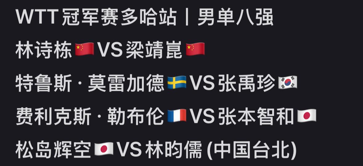 WTT多哈冠军赛1月9日下半场赛果及1月10日赛程 小勒布伦3:0邱党 陈熠2:3韩莹 小勒布伦3:0邱党, 林昀儒3:0奥恰洛夫, 陈幸同3:0朱芊曦, 陈熠输韩莹,有点意想不到! 小布在战胜邱党后更新: 精彩的胜利, 对今天自己的竞技状态非常满意, 已经迫不及待的明天的 男单1/4赛, 对阵张本智和! 期待今天小布击败张本智和! 林昀儒3:0奥恰洛夫, 比较意外, 没想到这么顺利, 去年的世界杯赛, 林昀儒苦战7局, 二分之差败给奥恰洛夫, 也是灯光的捣乱, 林昀儒今天是有备而来…… 陈熠2:3陈熠还是可惜啦, 被韩莹让二追三了, 对削球的理解还是不足啊!
