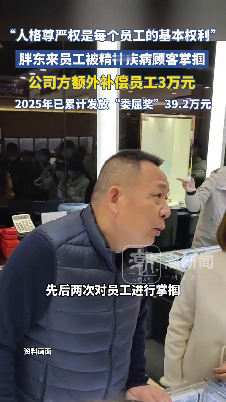 胖东来员工被精神疾病顾客掌掴,公司方额外补偿员工3万元,2025年已累计发放"委屈奖"39.2万元。 胖东来一员工毫无防备下遭顾客两次掌掴,家属证明有精神疾病,公司补偿该员工3万元。他们的尊严、人格高于一切,不是为胖东来而做,不是为顾客而做。 据大河报1月9日报道,胖东来许昌超市电工程某某在巡场期间劝阻对员工辱骂的顾客,并将其带离现场时,顾客在员工毫无防备下先后两次对员工进行掌掴,后证明患有精神疾病,随后胖东来补偿该员工3万元。 截至2025年,胖东来已给员工发放"委屈奖"共39.2万元,勇敢正义奖34.08万元,此外还有服务项目奖、文笔奖励等。