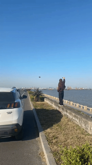 一名女子开车在路上偶遇一架正在进行飞行训练的国产武装直升机。 女子立马停下车,站