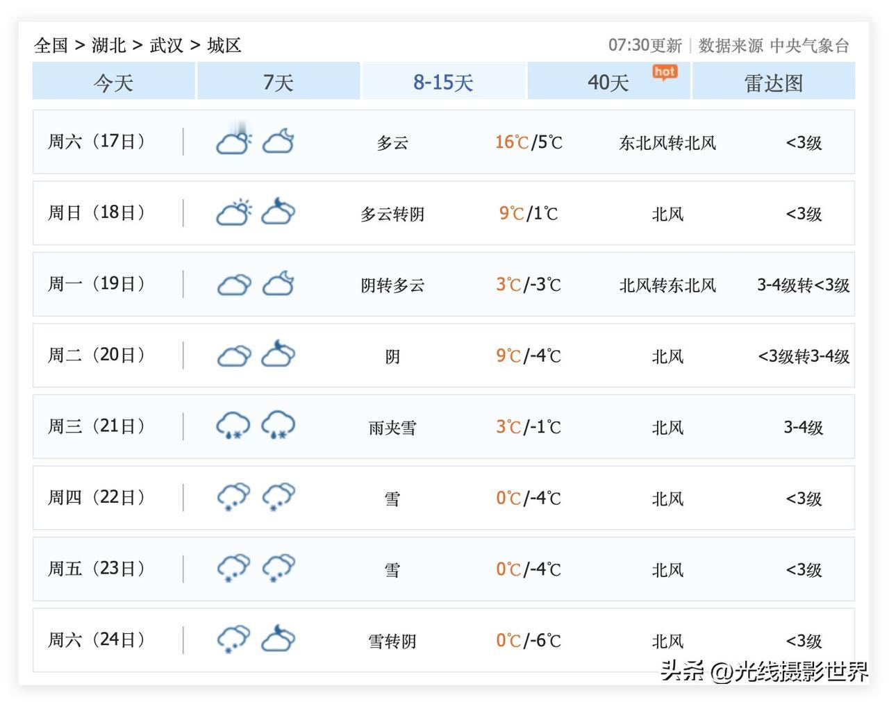 2个超级好消息!万万没想到,1月10日到17日,湖北省武汉市,最高气温21度,提前迎来春天甚至夏天!1月16日,武汉最高气温21度,身体健康的武汉人,可以穿短袖去武汉东湖植物园,看红梅花和腊梅花……啊啊啊!我的个天啊!武汉市,最近迎来了罕见的超级暖冬,真的太温暖啦! 可是,让大家惊喜的还在后面! 1月19日到24日,超强冷空气南下,超级寒潮,大范围雨雪天气…… 1月22日到24日,武汉市,可能连续三天下雪……大雪纷飞! 武汉市,最近这些年,太难遇到一场像模像样的大雪啦! 所以,摄影畅销书作家曾兰老师,光线摄影学院曾兰老师,有计划想要密切关注武汉天气预报,想要在1月17日18日左右预定1月21日去武汉的火车票或者机票……如果1月21日天气预报发生翻转,取消,退订火车票即可……没有任何损失! 但是,如果不早做规划和计划,如果不提前预定火车票……一旦错过武汉的大雪……那就……很伤心啊!