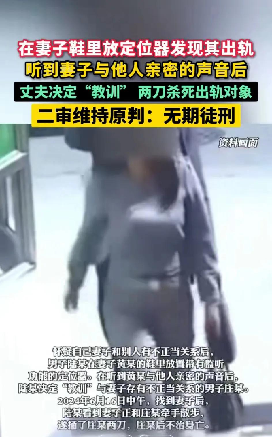 男子在妻子的鞋里放了定位器。发现了妻子出轨,并且听到了妻子与其他人约会的声音。恼羞成怒,两刀捅死出轨对象,二审维持原判,无期徒刑。他杀完人之后,自己报的警在原地等待被抓,有自首情节。 一开始他就发现妻子不对劲,对自己感情上很忽略。他怀疑妻子不对劲,买了定位器放在她的鞋子里。果然发现了妻子出轨的猫腻。万恶淫为首,这句话真的没错。 死了一个人,坐牢了一个人。毁了两个人的人生。