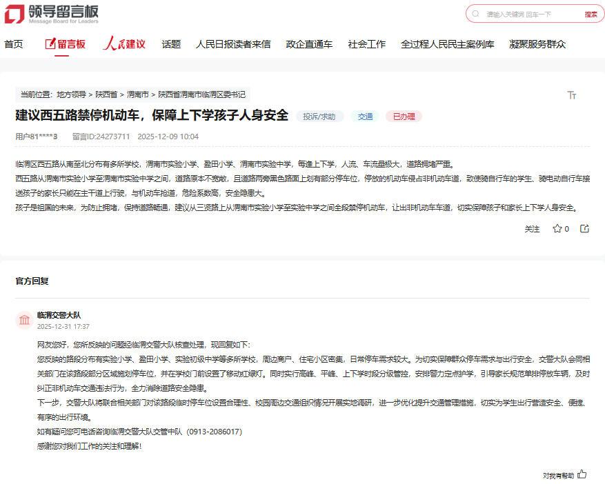 对此,临渭交警大队在回复中称,网友反映的路段分布多所学校,周边商户、住宅小区密集,日常停车需求较大。为切实保障群众停车需求与出行安全,已会同相关部门在该路段部分区域施划停车位,并在学校门前设置了移动红绿灯。同时实行高峰、平峰、上下学时段分级管控,安排警力定点护学,引导家长规范单排停放车辆,及时纠正非机动车交通违法行为,全力消除道路安全隐患。
