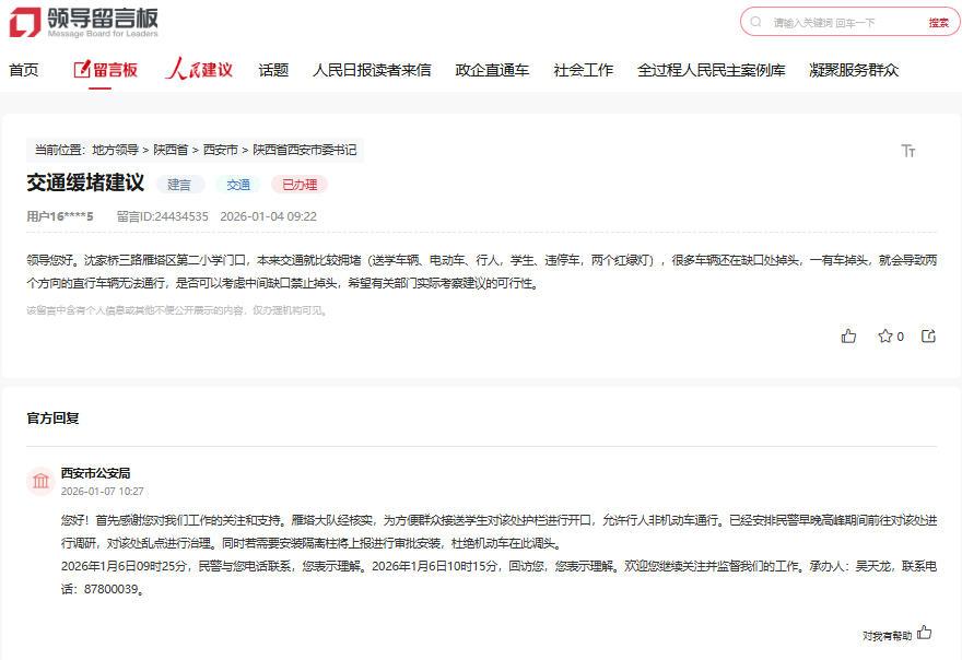 针对网友建议,西安市公安局迅速展开核实并作出回应,为方便群众接送学生,对该处护栏进行开口,允许行人与非机动车通行。目前已经安排民警早晚高峰期间前往此处进行调研、治理,若需要安装隔离柱,将上报进行审批安装。