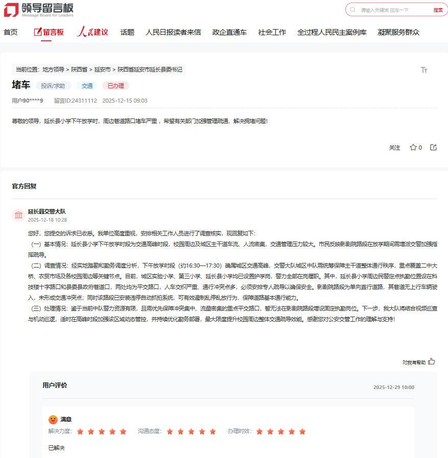 近日,延安市延长县一名网友在留言中称,延长县小学下午放学时段,周边巷道路口堵车严重,希望有关部门加强管理,解决该问题。