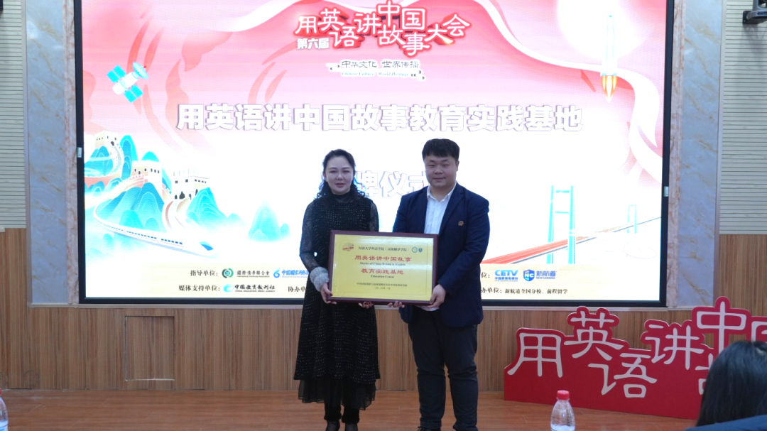 活动现场,周金靓代表组委会向河南大学外语学院进行“用英语讲中国故事教育实践基地”授牌,标志着河南大学外语学院成为该活动在河南的重要文化育人基地。