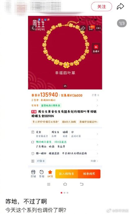 2026年1月9日,周生生珍珠四叶草婚嫁款项链售价从前一日的12.08万元跳涨至13.6万元,涨幅12.6%,客服回应称因国际金价飙升及物料、专利设计成本上升而调整。