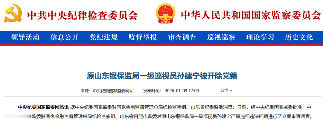 中央纪委国家监委网站讯据中央纪委国家监委驻国家金融监督管理总局纪检监察组、山东省纪委监委消息:日前,经中央纪委国家监委批准,中央纪委国家监委驻国家金融监督管理总局纪检监察组、山东省日照市监委对原山东银保监局一级巡视员孙建宁严重违纪违法问题进行了立案审查调查。