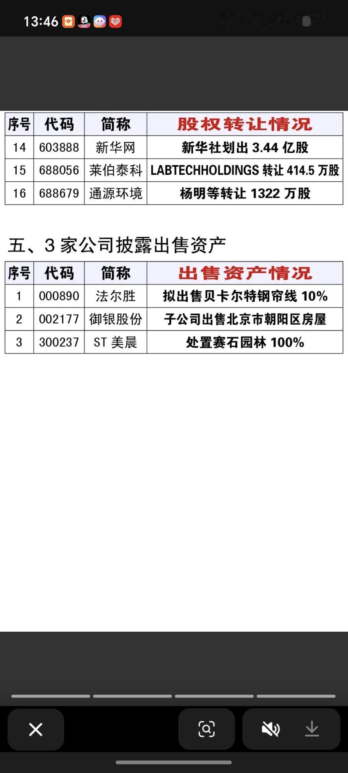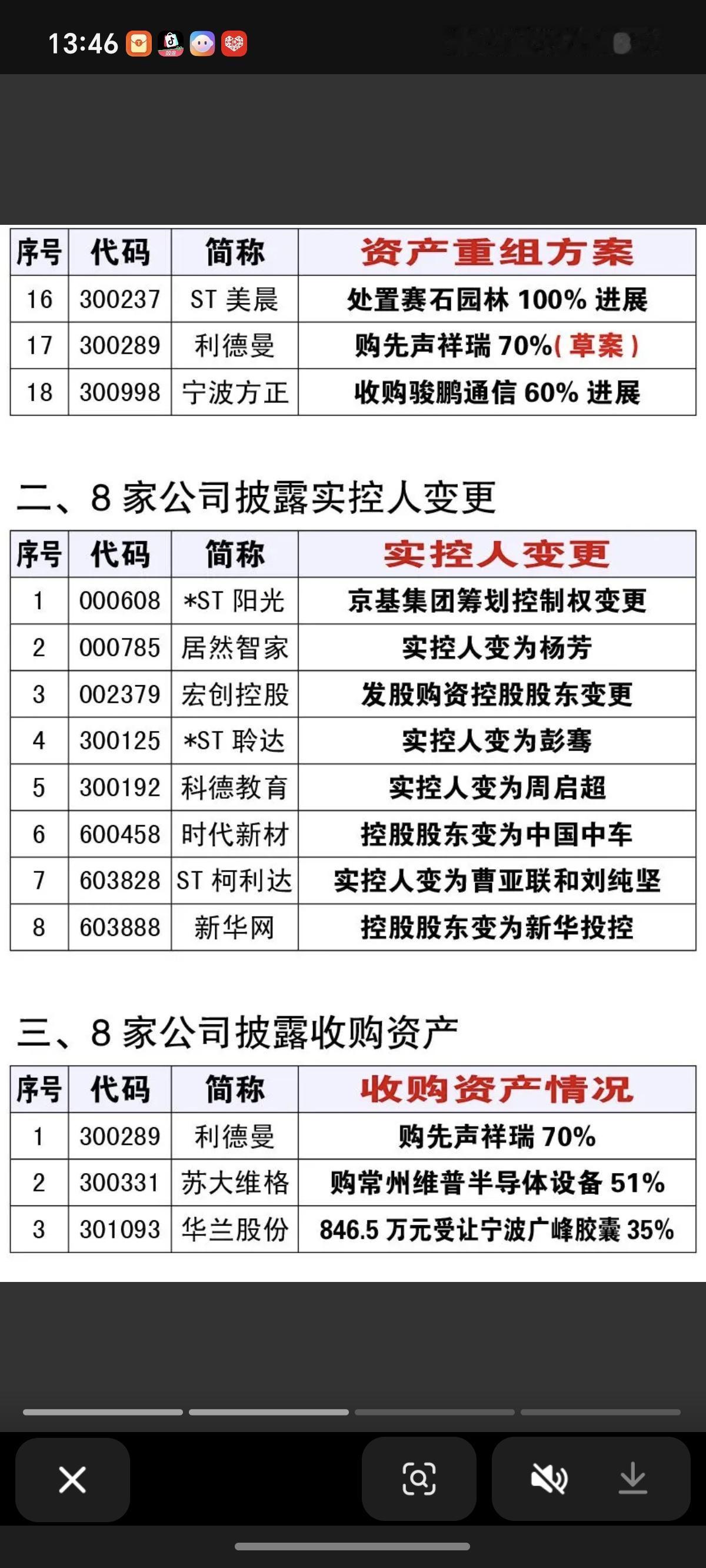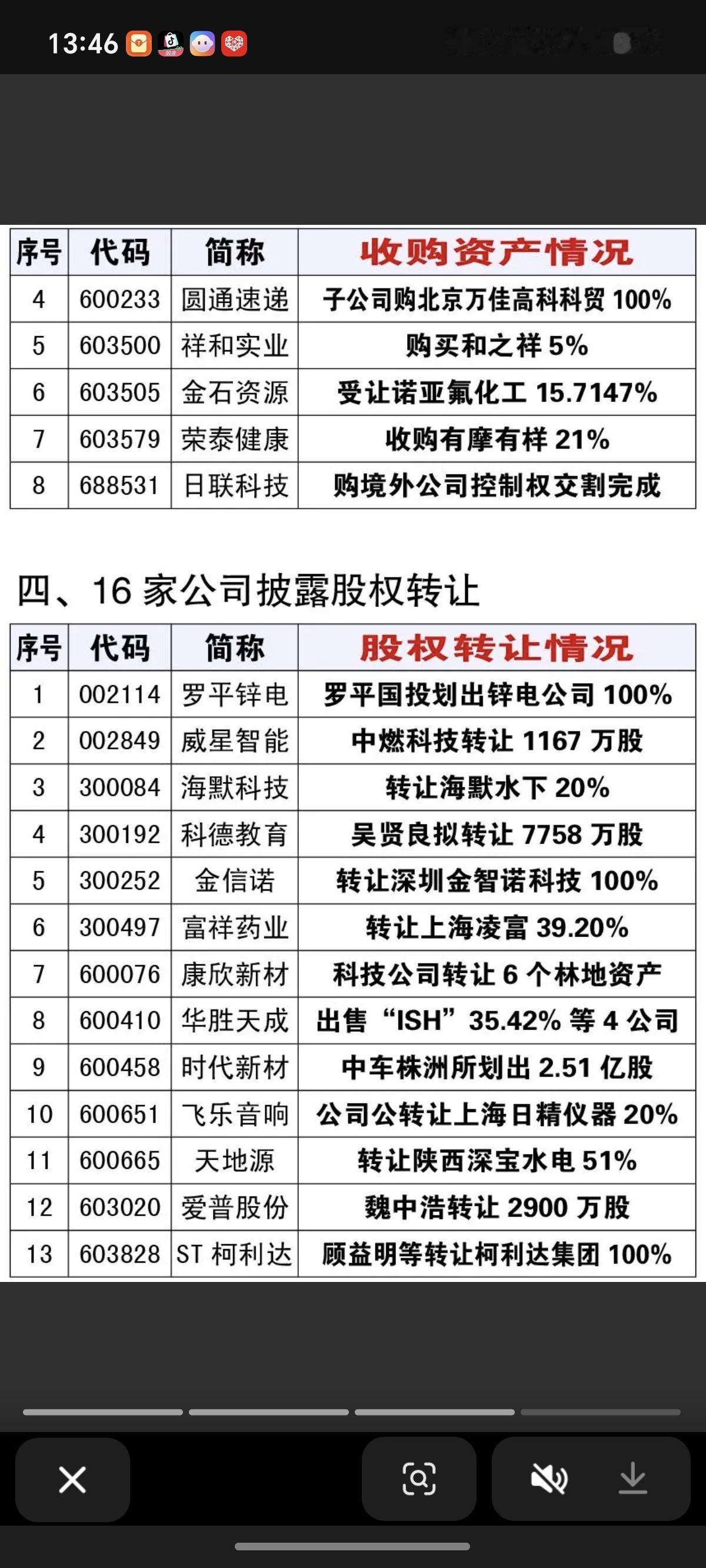 1.10周六 最新:资产重组、实控人变更、股权转让公告! 18家资产重组事项,资源整合,潜在机会 8家实控人变更,8家公司收购资产,多元化经营,拓展机会 16家股权转让,3家公司出售资产改善经营利润