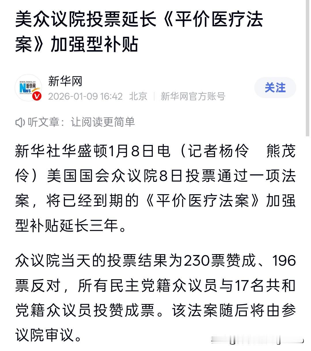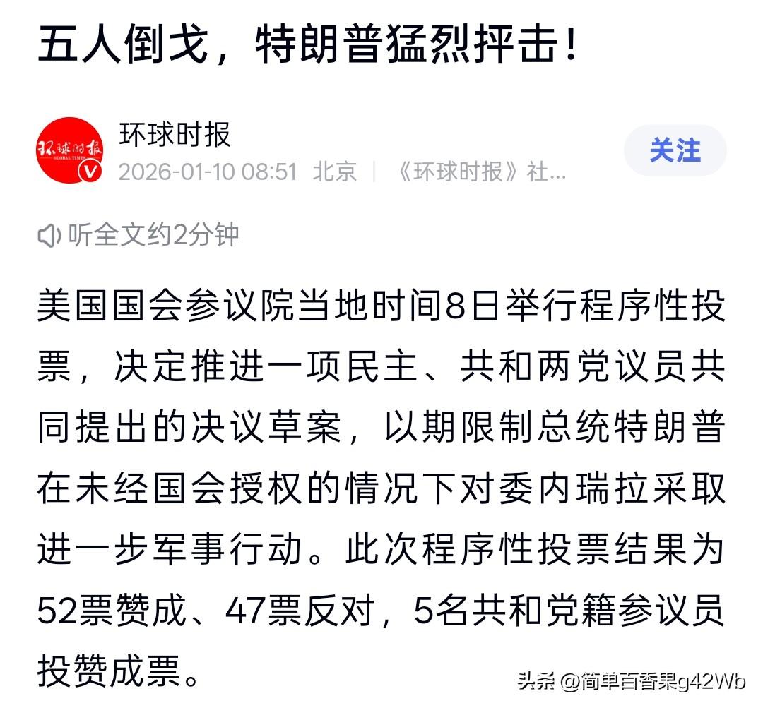 特朗普怒了,共和党人倒戈,美国政坛怎么了? 2026年初,特朗普再次成为全球焦点。他下令对委内瑞拉采取行动,抓捕了总统马杜罗,声称是为了打击毒品犯罪,却引来国际社会一片声讨,指责他违反国际法。然而,他对此不予理会,还宣称“不需要国际法”。 与此同时,美国国内也状况频出。1月8日,众议院就一项医疗补贴法案进行投票,该法案以230票赞成、196票反对的结果意外通过。 让特朗普尤为恼火的是,有17名共和党议员投了赞成票。这一法案本是他一直反对的,如今党内成员背着他支持该法案,让他颜面尽失。更糟的是,参议院也来添乱,以52比47的投票结果推动一项决议,旨在限制他对委内瑞拉继续动武,其中有5名共和党参议员倒戈。 这些情况表明,连他的党内成员都开始对他不满。以往众人都对他言听计从,如今却有人不再买账。格林曾是他的铁杆支持者,如今也对他避之不及。他的支持率降至36%,中期选举形势堪忧。他急了,一面要稳住党内局面,一面还得在对外事务上保持强硬姿态。 他迅速采取了一系列行动。先是宣布退出66个国际组织,称要节省资金用于美国建设。接着放话,2027年军费将增至1.5万亿美元。还下令美军飞机飞往欧洲,部队随之调动,甚至“末日飞机”也升空待命,显然是在防备俄罗斯的报复。 他对俄罗斯也毫不手软,扣押油轮并宣称要扩大制裁。还扬言,如果普京不签署停火协议,美国将向乌克兰提供“战斧”导弹。他嘴上说着渴望和平、想拿诺贝尔奖,手上的动作却一刻未停。一边呼吁停战,一边又威胁伊朗,军机全部部署到位。 对于乌克兰,他也开始清算。称拜登向乌克兰提供了3500亿美元,却毫无收益。如今他与泽连斯基达成协议,美国要获取乌克兰的资源,否则不再提供武器。言下之意,乌克兰若想生存,就得交钱交矿。 他还警告印度,若莫迪不主动致电,就别想谈贸易协议,以此逼迫印度减少购买俄罗斯石油。随后又向叙利亚示好,促成美以叙三方合作,声称要进行情报共享。这一系列操作,无一不是利益交换。 在委内瑞拉问题上,第二波打击暂时取消,但军舰并未撤离,随时可能再次发动攻击。他称这是“明智之举”,实则是缓兵之计,意在缓解国内的巨大压力。 目前,他面临两条路:要么低头改变策略,要么继续强硬对抗。但从他的表现来看,显然不想认怂。可问题在于,盟友不再信任他,对手也不惧怕他,甚至党内成员都开始背离他。 特朗普政策变脸