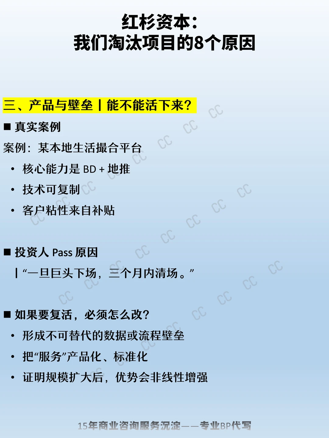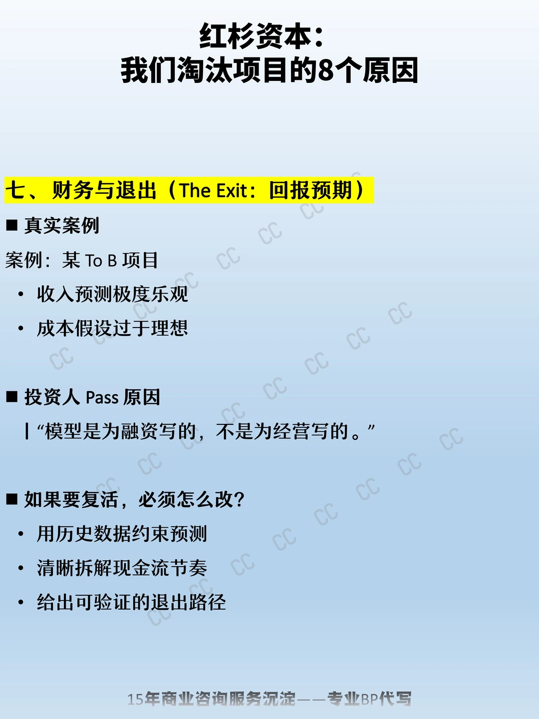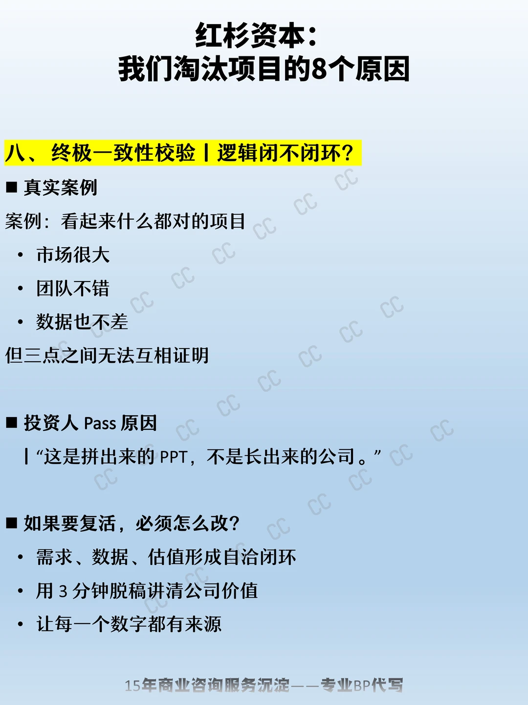 你可能不知道, 80% 的 BP,不是输在商业模式,而是输在“投资人根本没看完” 因为 BP 从来不是展示稿, 而是一套必须替投资人降低决策风险的投决工具 当你的 BP 无法在每一页消除一个疑虑, 项目基本已经在前 5 分钟被默默 Pass 这 8 条是红杉内部用来“快速淘汰项目”的真实判断标准
