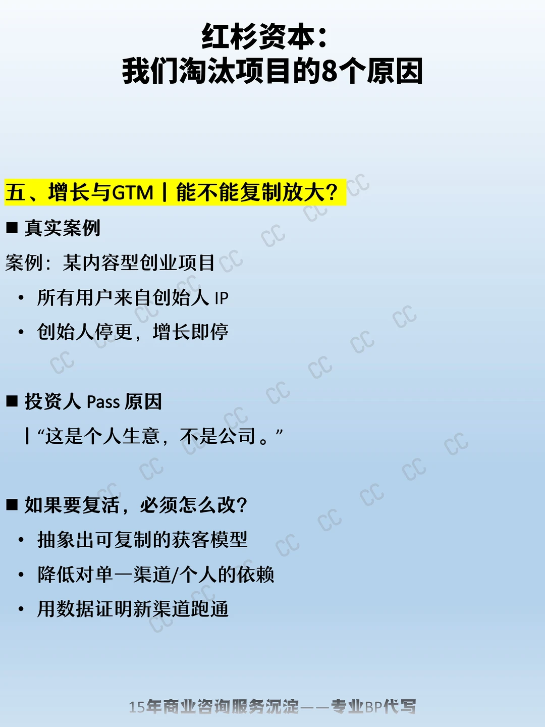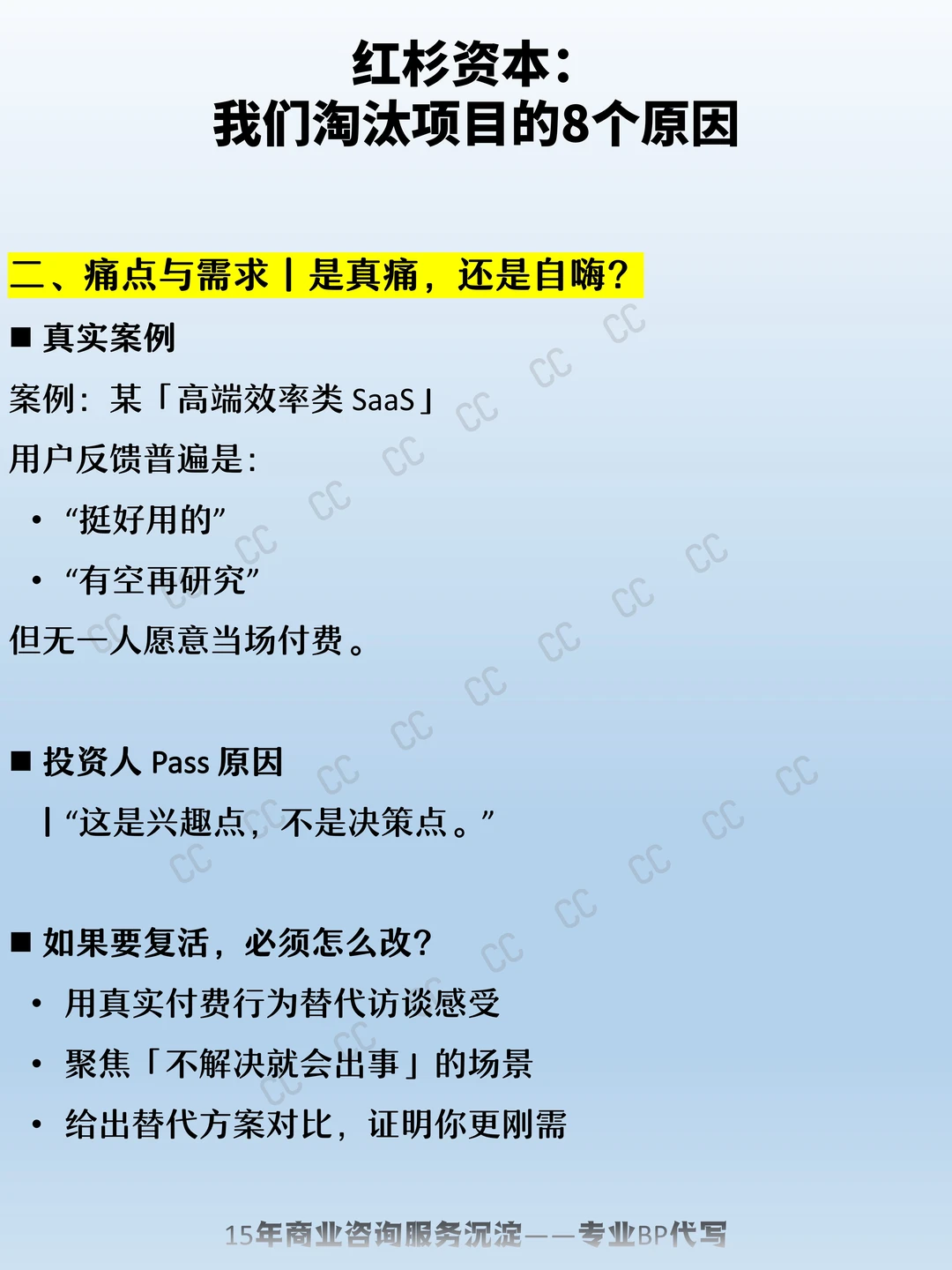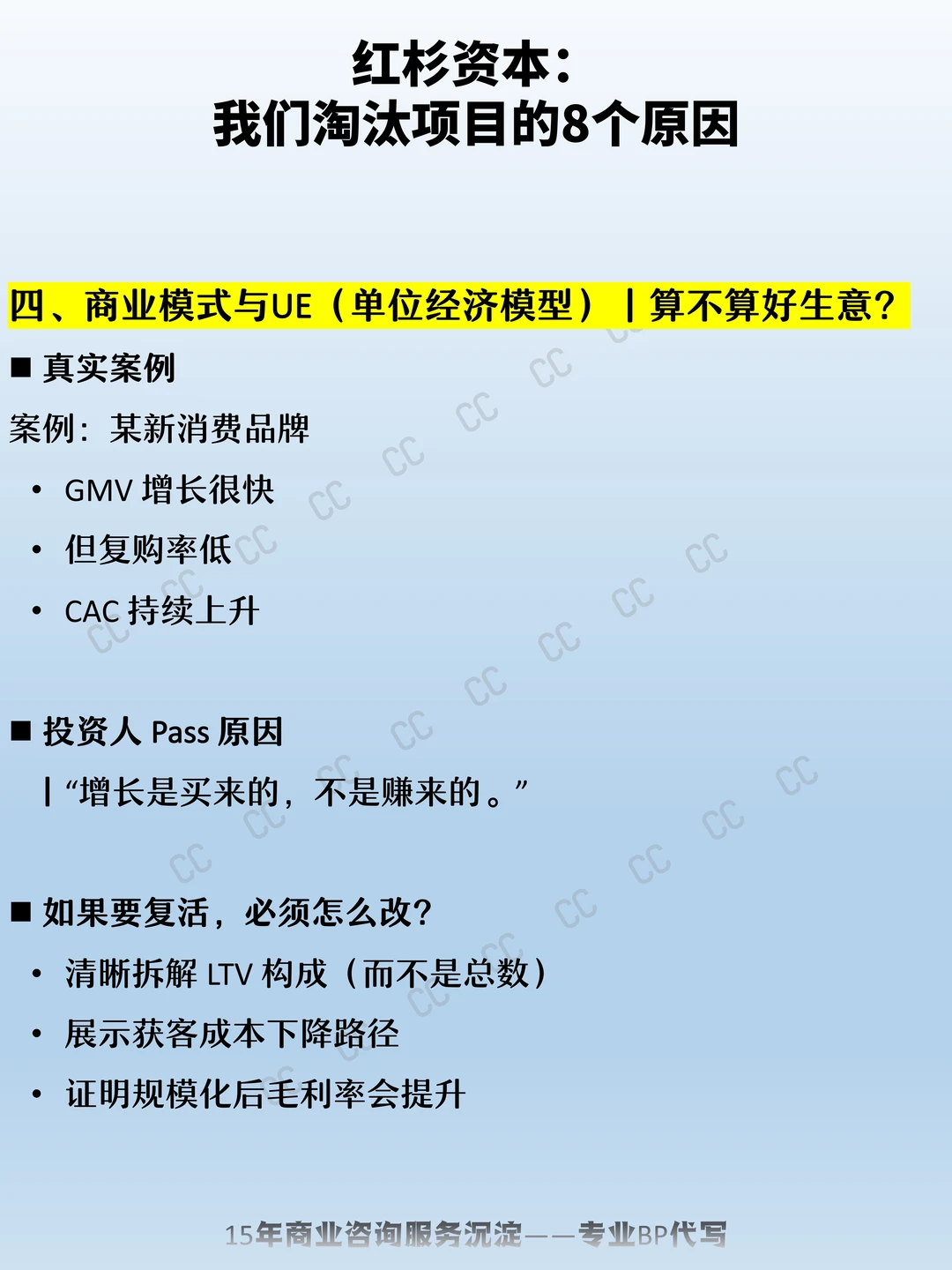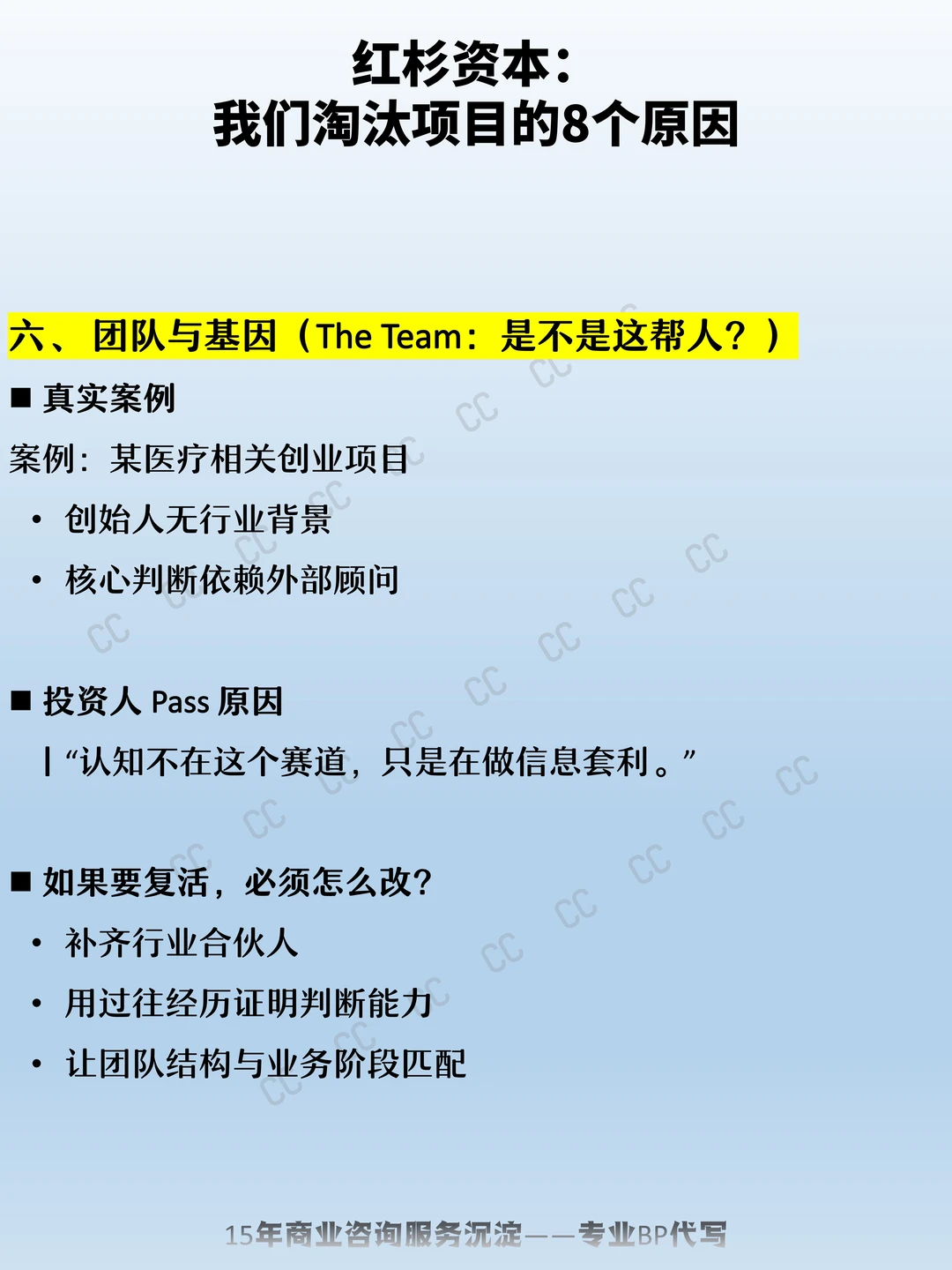 你可能不知道, 80% 的 BP,不是输在商业模式,而是输在“投资人根本没看完” 因为 BP 从来不是展示稿, 而是一套必须替投资人降低决策风险的投决工具 当你的 BP 无法在每一页消除一个疑虑, 项目基本已经在前 5 分钟被默默 Pass 这 8 条是红杉内部用来“快速淘汰项目”的真实判断标准