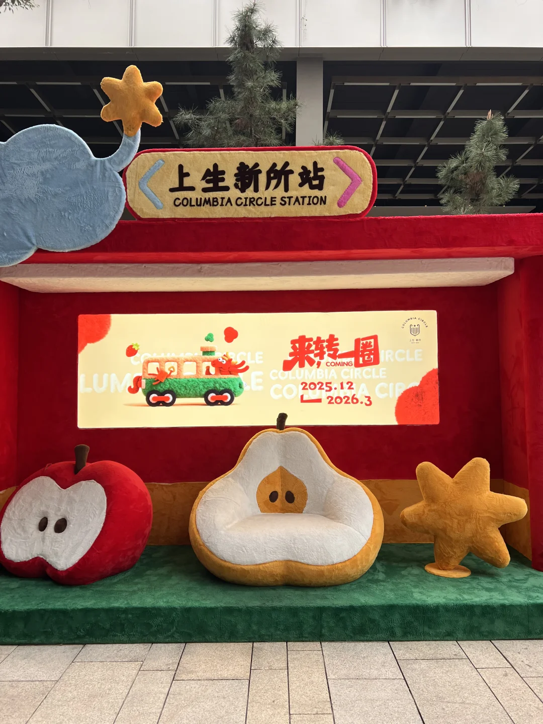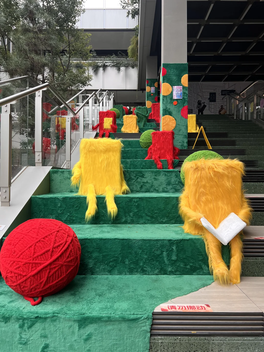 🧣被绿意蔓延的楼梯,挂上了暖绒绒的巨型围巾,台阶上是毛绒绒的“新朋友”,还有苹果和生梨造型的沙发…