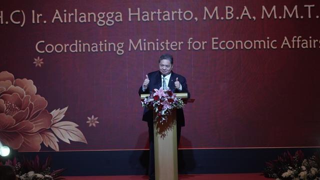 1月9日,在印度尼西亚雅加达,印度尼西亚经济统筹部长艾尔朗加在印尼中国商会总会成立二十周年庆典上致辞。新华社发