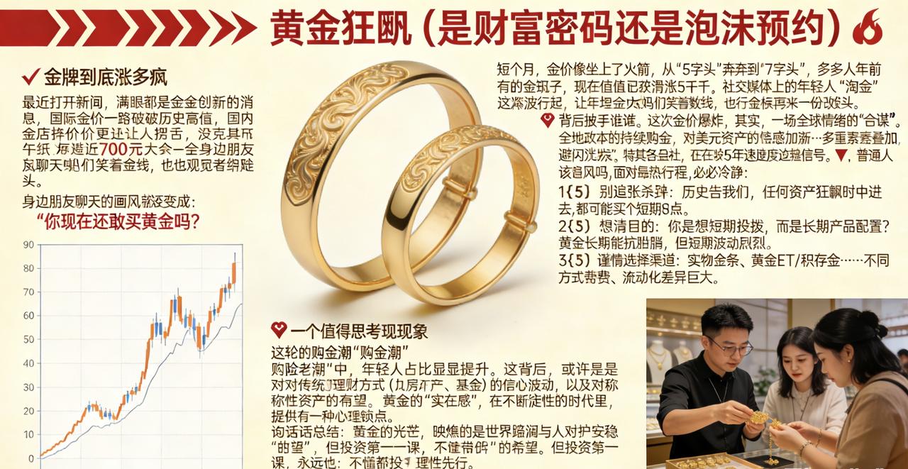 🔥 黄金狂飙!是财富密码,还是泡沫预警? 🔥 最近打开新闻,满眼都是金价创新高的消息。国际金价一路冲破历史高位,国内金店挂牌价更是让人咋舌,每克逼近700元大关!身边朋友聊天的画风都变成了:“你现在还敢买黄金吗?” 📈 金价到底涨得多疯? 短短一个月,金价像坐上了火箭。从“5字头”狂奔到“7字头”,不少人年前买的金镯子,现在市值已经涨了大几千。社交媒体上,年轻人“淘金”热潮兴起,银行金条甚至一度断货。这波行情,让早年囤金的大妈们笑着数钱,也让观望者纠结跺脚。 🕵️ 背后推手是谁? 这次金价暴涨,其实是一场全球情绪的“合谋”。地缘政治动荡、全球央行持续购金、对美元资产的疑虑加深……多重因素叠加,让黄金这位“避险老祖宗”重新闪闪发光。尤其各国央行,正在以55年来最快的速度囤积黄金,这释放了强烈的信号。 💡 普通人该跟风吗? 面对高热行情,务必冷静: 1️⃣ 别追涨杀跌:历史告诉我们,任何资产狂飙时冲进去,都可能买在短期高点。 2️⃣ 想清目的:你是想短期投机,还是长期资产配置?黄金长期能抗通胀,但短期波动剧烈。 3️⃣ 谨慎选择渠道:实物金条、黄金ETF、积存金……不同方式手续费、流动性差异巨大。 🤔 一个值得思考的现象 这轮“购金潮”中,年轻人占比显著提升。这背后,或许是对传统理财方式(如房产、基金)的信心波动,以及对确定性资产的渴望。黄金的“实在感”,在不确定的时代里,提供了一种心理锚点。 一句话总结:黄金的光芒,映照的是世界的忐忑与人们对“安稳”的渴望。但投资的第一课,永远是:不懂不投,理性先行。 你最近关注金价了吗?你觉得现在是入手时机,还是风险已高?评论区聊聊!👇