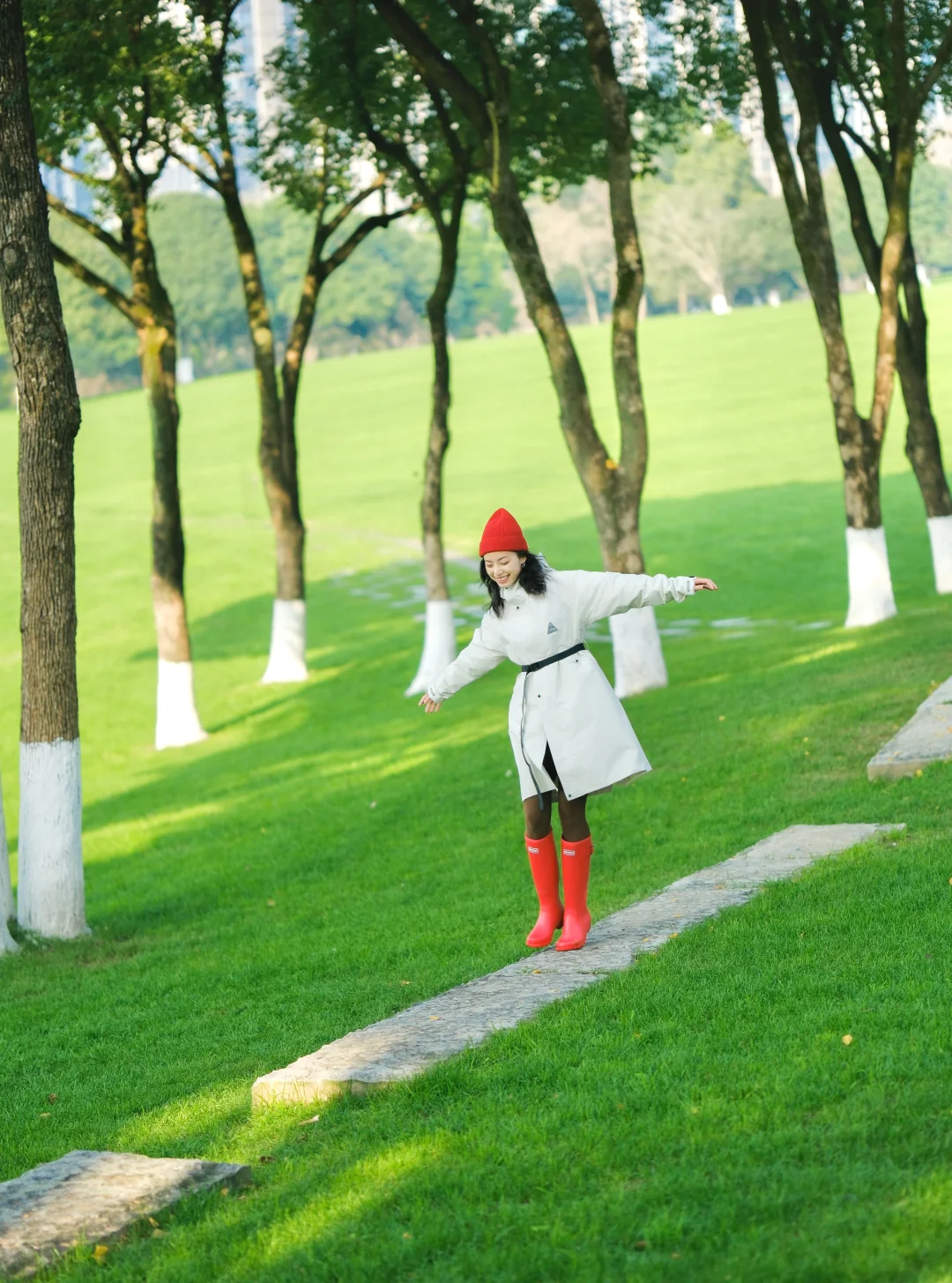 3️⃣上午的阳光照进树林,树木的影子会投在草坪上,可以走到树影的位置,拍光影会很好看