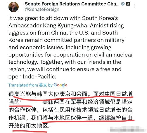 美国开始敲打李在明了!李在明访华行程刚一结束,美国参议院外交关系委员会主席吉姆·里施就约见韩国驻美大使康京和,其表态对我们非常不友好!1月8日,吉姆·里施刊文表示,很高兴能与韩国大使康京和会面。此人声称,面对中国日益增强的“侵略性”,美韩两国在军事和经济领域仍是坚定的合作伙伴,包括在民用核技术领域日益增长的合作机遇。   美国这种急不可耐的表态,说白了就是冲着李在明访华的成果来的。   中韩双方甚至敲定要让中断7年的商贸部长级会议定期化,摆明了要把两国关系往回暖的方向推,这显然戳中了美国的敏感神经。   吉姆·里施特意提民用核技术合作,这步棋打得很有算计。就在他见康京和的同一天,美韩刚正式签署核出口合作的谅解备忘录,这份文件表面说要拓展第三国市场,实则藏着美国捆绑韩国的心思。   要知道,韩国核电企业之前和美国西屋电气的合作一直闹得不愉快,韩企得支付高额专利费不说,连自己研发的新技术都要接受对方验证,被韩国国内骂成“卖国协议”。美国这会儿把核合作搬出来,就是想拿好处绑住韩国的手脚,警告李在明别在对华合作上走太远。   里施口中“中国的侵略性”纯属无稽之谈,这话更像是说给韩国听的警告。李在明访华时反复强调“好邻居千金难换”,还明确表示韩方尊重中国核心利益、坚持一个中国原则。   这种表态让美国坐不住了,毕竟美国一直想把韩国绑进反华小圈子,之前就多次施压韩国介入台海、加入芯片限制阵营,只是韩国始终没松口。这次李在明用实际行动拉近中韩关系,美国自然要立刻跳出来刷存在感,生怕韩国脱离自己的掌控。   康京和的处境其实挺尴尬的。她作为韩国驻美大使,既要听美国的施压,又得顾及本国的实际利益。韩国经济对中国的依赖度摆在那,中韩贸易额比韩美加韩日的总和还多,真要跟着美国反华,韩国企业首先扛不住。   但美国又是韩国的军事盟友,里施这种参议院外交关系委员会主席的表态,她根本没法忽视,毕竟这人之前连肯尼亚和中国合作都要横插一脚,对盟友的控制欲从来都很强。   更值得琢磨的是时间点的巧合。李在明7日刚结束访华,里施8日就见大使、发文章,这种节奏明显是早有准备。   美国显然一直在盯着李在明的访华行程,想趁他还没完全梳理好对华合作思路,先下手敲打一番。毕竟中韩关系刚有回暖迹象,美国最怕看到的就是自己的盟友和中国走得太近,尤其是在人工智能、绿色产业这些美国也想争夺的新兴领域。   韩国现在的外交处境确实难。李在明本来想在中美之间找平衡,既想靠美国保障安全,又不想丢了中国这个大市场。他这次访华带了那么多企业家,就是想把经济合作的盘子做大,可美国偏要在这时逼韩国选边站。   更麻烦的是,美国之前空袭委内瑞拉抓走马杜罗,已经让韩国在半岛问题上的计划受挫,现在又来施压对华政策,韩国夹在中间根本没法轻松喘气。   里施反复提“维护自由开放的印太地区”,这话听着冠冕堂皇,实际就是想维持美国在亚太的霸权。   韩国自己公布的“印太战略”里压根没提反华,反而明确说要和中国合作,因为韩国很清楚,和中国对抗不符合自己的利益。美国当然知道这一点,所以才急着用核合作利益诱惑、用“中国威胁论”施压,双管齐下逼韩国妥协。   说到底,美国这波操作就是典型的霸权逻辑。自己搞阵营对抗还不够,还见不得别的国家和中国正常合作。李在明访华推动中韩关系回暖,本是有利于地区和平的好事,美国却非要从中作梗。只是韩国的利益需求摆在那,不是美国敲几下桌子就能改变的,接下来就看李在明怎么在中美之间继续找平衡了。