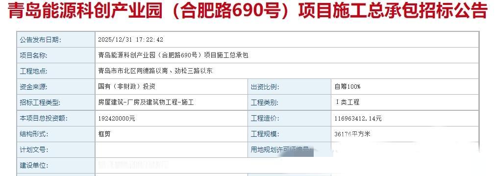 近日,青岛能源科创产业园(合肥路690号)项目施工总承包招标公告发布!项目位于市北区同德路以南、劲松三路以东,占地面积7333.70平方米,总建筑面积36176平方米,总投资额1.9242亿元,招标单位为青岛能源集团旗下的青岛市热电工程有限公司,计划工期550天。