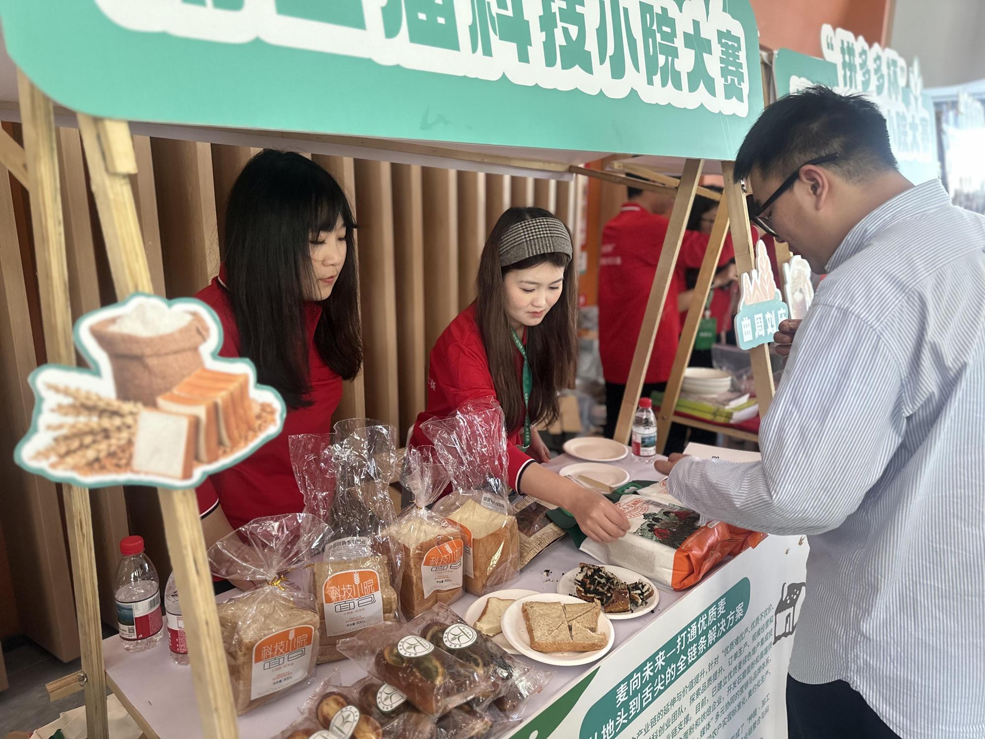 赛场外的产品展台,团队成员正在推介“科技小院面包”(记者韩雪莹摄)