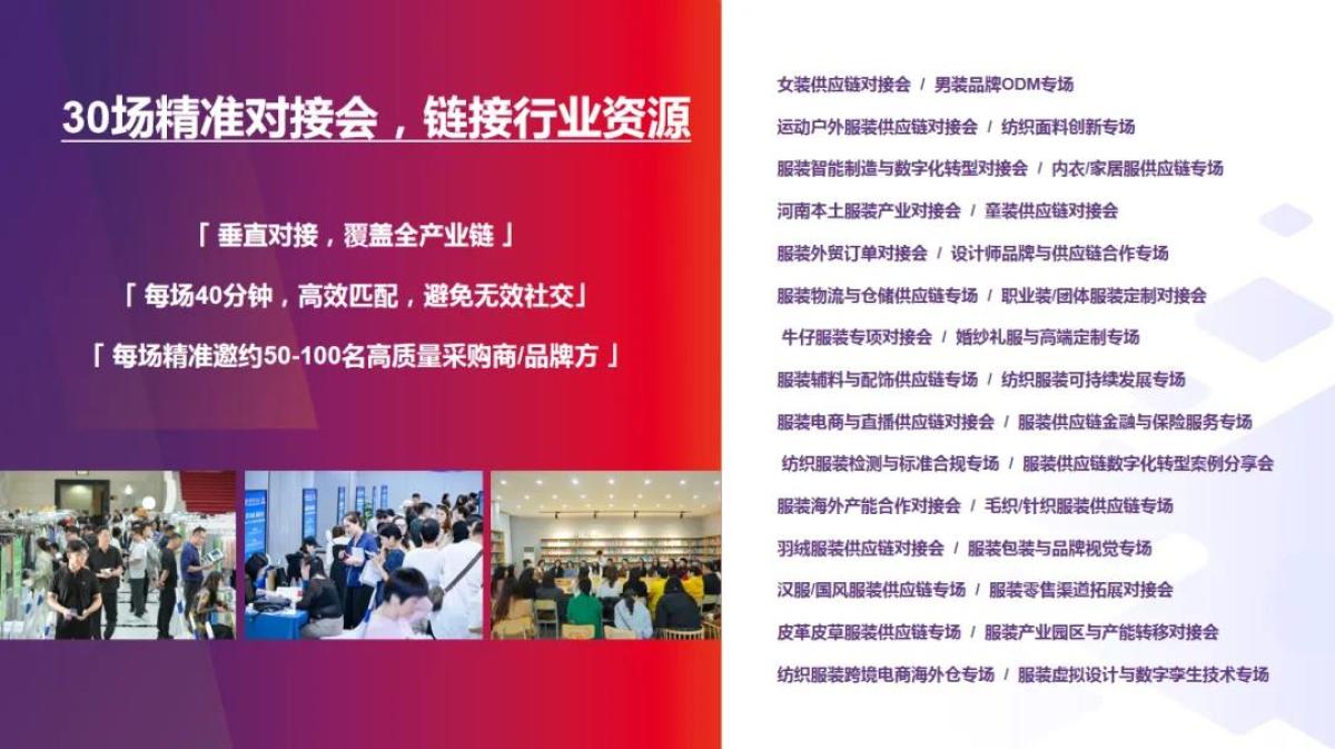 活动创新采用“会、展、秀、演、学、商”六位一体模式,不仅集中呈现行业最新产品与技术,更将举办30余场精准高效的产业对接会,强力保障参展商“成交机会”。大会旨在汇聚全国行业精英,促进资源优化配置,推动技术创新与产业链深度融合,为河南由“纺织服装大省”向“纺织服装强省”跨越注入强劲动力。