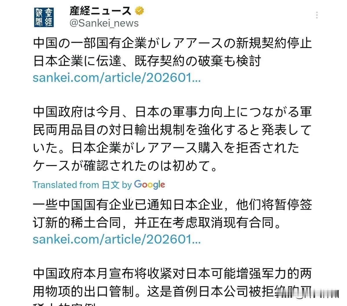 1月10日,据日本产经新闻报道,中国部分国有企业已通知日本企业,暂停签订新的稀土合同,同时正探讨取消现有合同,这是日本企业首次被拒绝购买稀土。 此次举措源于中国政府本月发布的出口管制政策,中方明确将收紧对日本可能用于增强军事力量的军民两用物项的出口管制,稀土作为战略资源成为管制重点。日本工业体系对中国稀土依赖度极高,此举或将对其汽车、电子等支柱产业及军工配套产业产生冲击。 评几句: 日本产经新闻曝出的消息,直接戳中日本软肋——中国国企暂停对日新稀土合同,甚至考虑撕毁旧约,这是日本企业头一回被拒购稀土,背后是中方落实本月发布的出口管制政策,针对的正是日本军民两用物项流向军工领域的风险! 稀土是“工业维生素”,更是军工装备的核心原料,日本工业超九成稀土依赖中国供应,小到汽车芯片,大到战机雷达,少了稀土根本无从谈起。中方此次升级稀土出口管制,明确收紧对日本可能用于增强军力的军民两用物项出口,本质就是掐住了日本军工升级的物资命脉。 日本一直试图摆脱对中国稀土的依赖,转战澳洲、东南亚寻找替代源,但这些地区的稀土开采提炼技术远落后于中国,短期内缺口根本无法填补。这次稀土管制升级,不仅会让日本汽车、电子产业面临断供风险,更会让其军工扩张计划直接卡壳。 说到底,中方的稀土牌,不是打贸易战,而是划下红线:借军民两用物资搞军力扩张,必然要付出产业代价!日本若仍执迷不悟,后续的产业阵痛只会更剧烈。