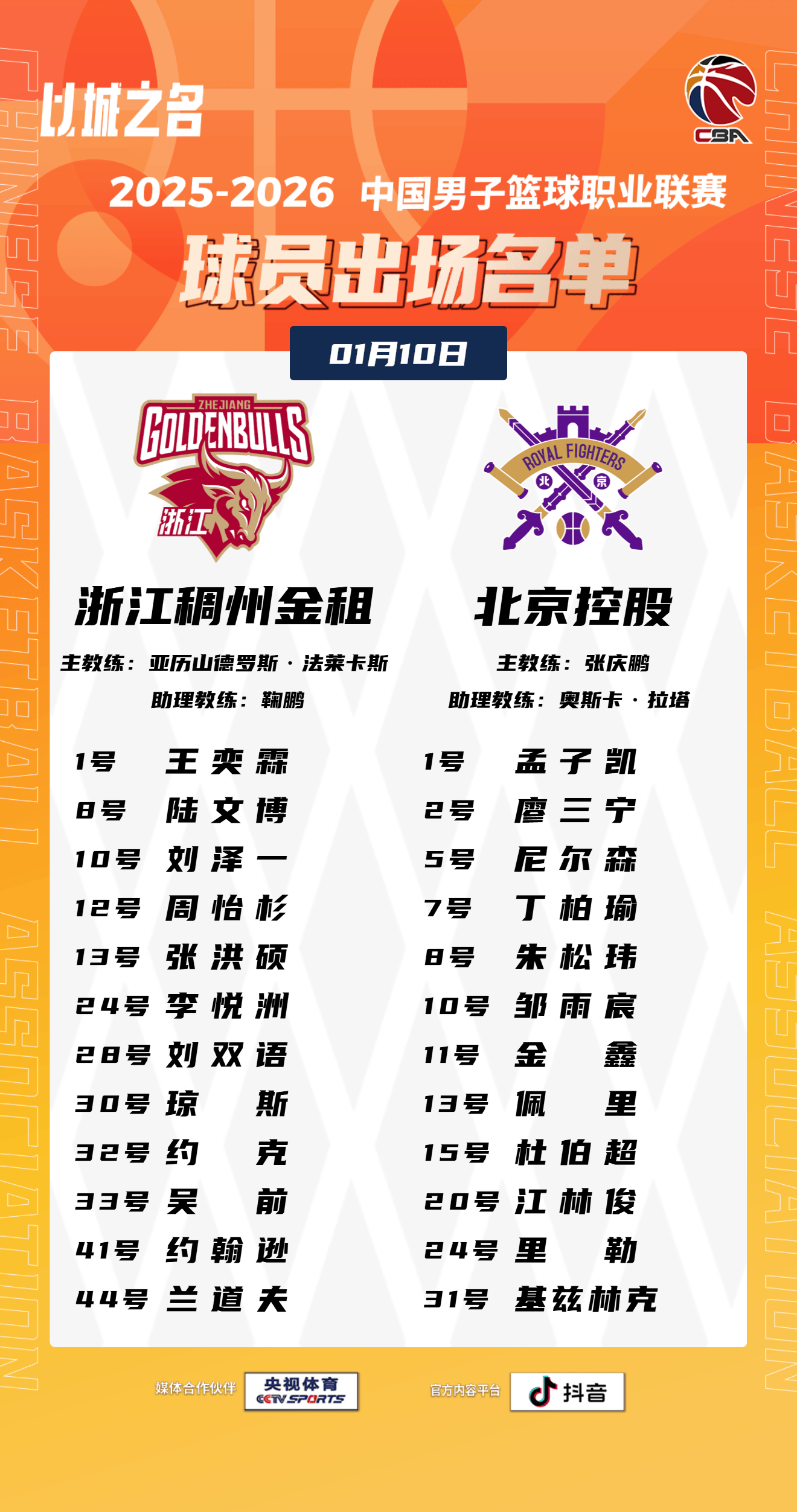 虎扑01月10日讯今晚CBA常规赛,北控对阵浙江的大名单已经公布。