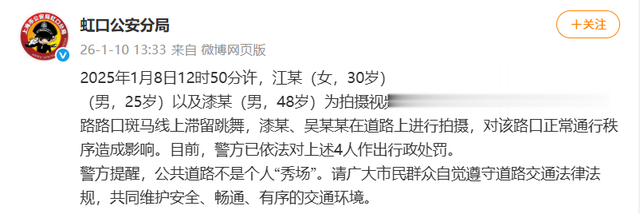 2026年1月8日12时50分许,江某(女,30岁)、吴某(男,35岁)、吴某某(男,25岁)以及漆某(男,48岁)为拍摄视频,由江某、吴某在四川北路天潼路路口斑马线上滞留跳舞,漆某、吴某某在道路上进行拍摄,对该路口正常通行秩序造成影响。目前,警方已依法对上述4人作出行政处罚。