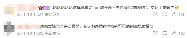 部分观点认为Joe的真诚投入是青春期自然表现,赞其"恋爱脑会照顾人";少数声音质疑16岁官宣恋情过早,但更多人认可坦率优于隐瞒。