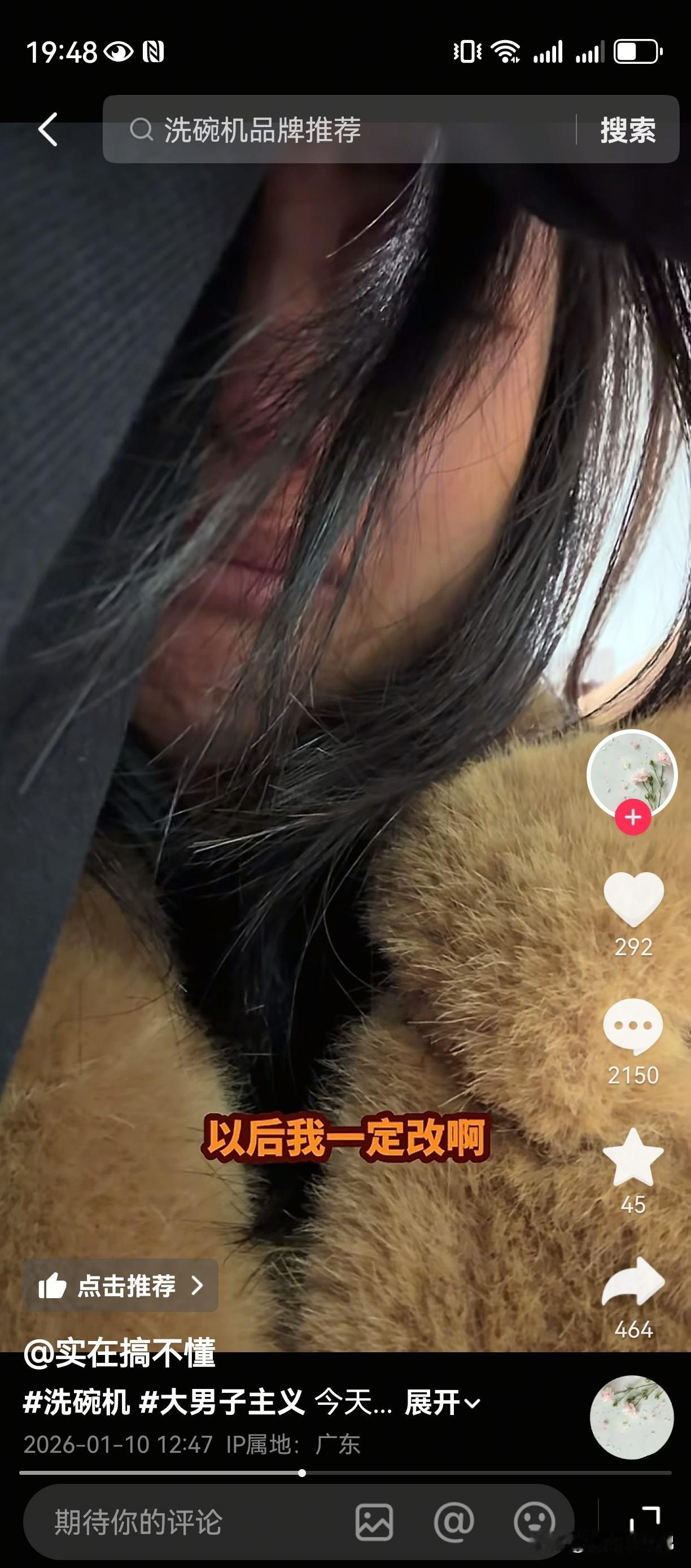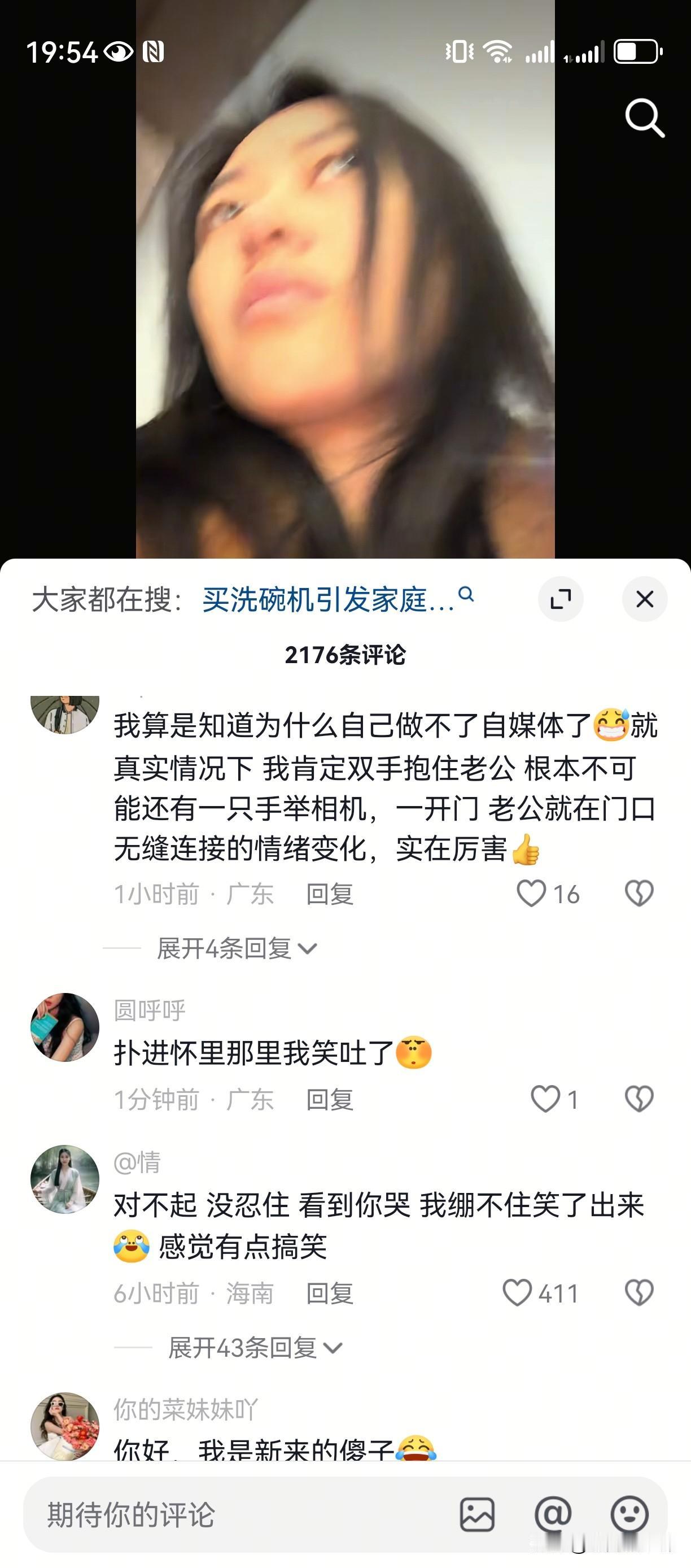 买洗碗机的女子回家了!一头扑进老公怀里哭唧唧,手机却保持拍摄,这个场景把大家整笑了[捂脸][捂脸]。我也没憋住笑场了,谁能告诉我,图二是什么角度啊,她老公抱着她,她从胳肢窝下面探个头出来对着手机哭吗?如果真是这样的话,她老公可真高啊! 她一进门就开始哭,她老公就开始哄她,说买买买,买个实用的洗碗机,你受苦了,看了你的直播了。 网络时代就是好,两口子吵架,不用邻居劝和,不用领导主持公道,一个直播诉诉苦,一个看看直播,两个人瞬间就和好了。 结局是好的,至于被网友骂起号的,想要带货的,只能说她起号起的不错,几天时间6500多粉丝了。