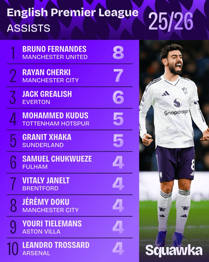 虎扑01月10日讯Squawka统计了本赛季英超联赛的助攻榜,详情如下: