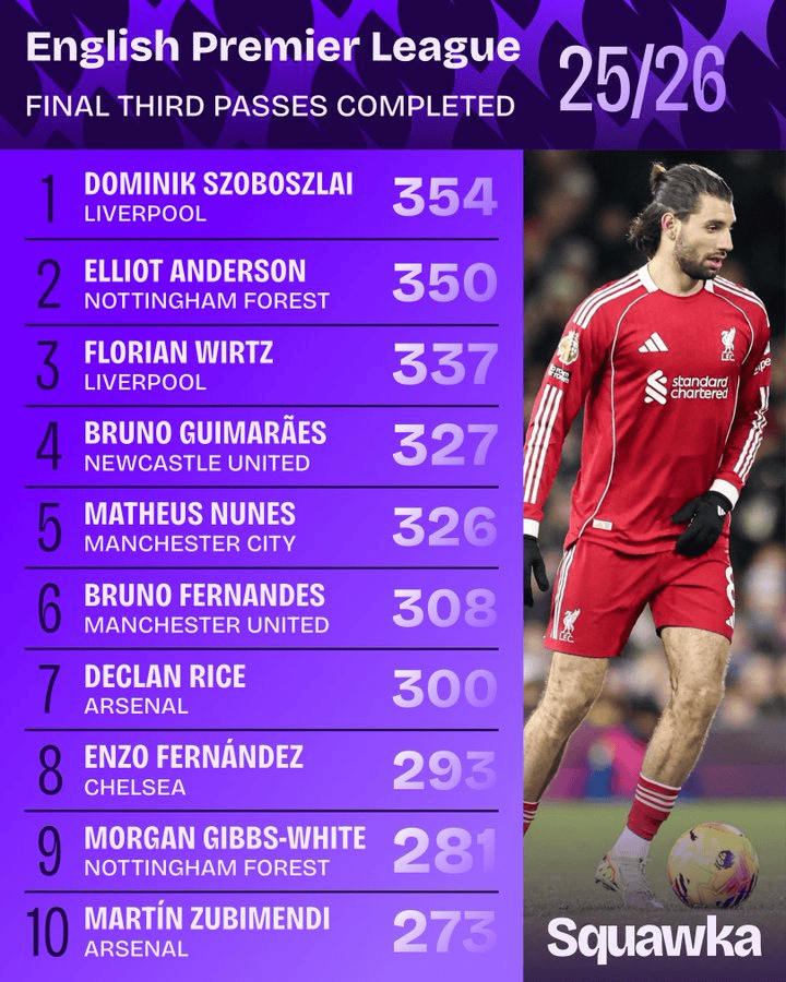 虎扑01月10日讯Squawka统计了本赛季英超联赛在进攻三区完成最多次成功传球的球员: