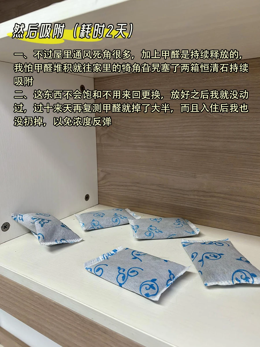 一、不过屋里通风死角很多,加上甲醛是持续释放的,我怕甲醛堆积就往家里的犄角旮旯塞了两箱恒清石持续吸附