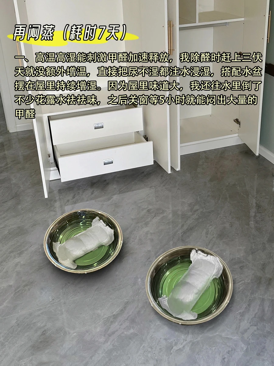 一、高温高湿能刺激甲醛加速释放,我除醛时赶上三伏天就没额外增温,直接把尿不湿都注水浸湿,搭配水盆摆在屋里持续增湿。因为屋里味道大,我还往水里倒了不少花露水祛祛味,之后关窗等5小时就能闷出大量的甲醛