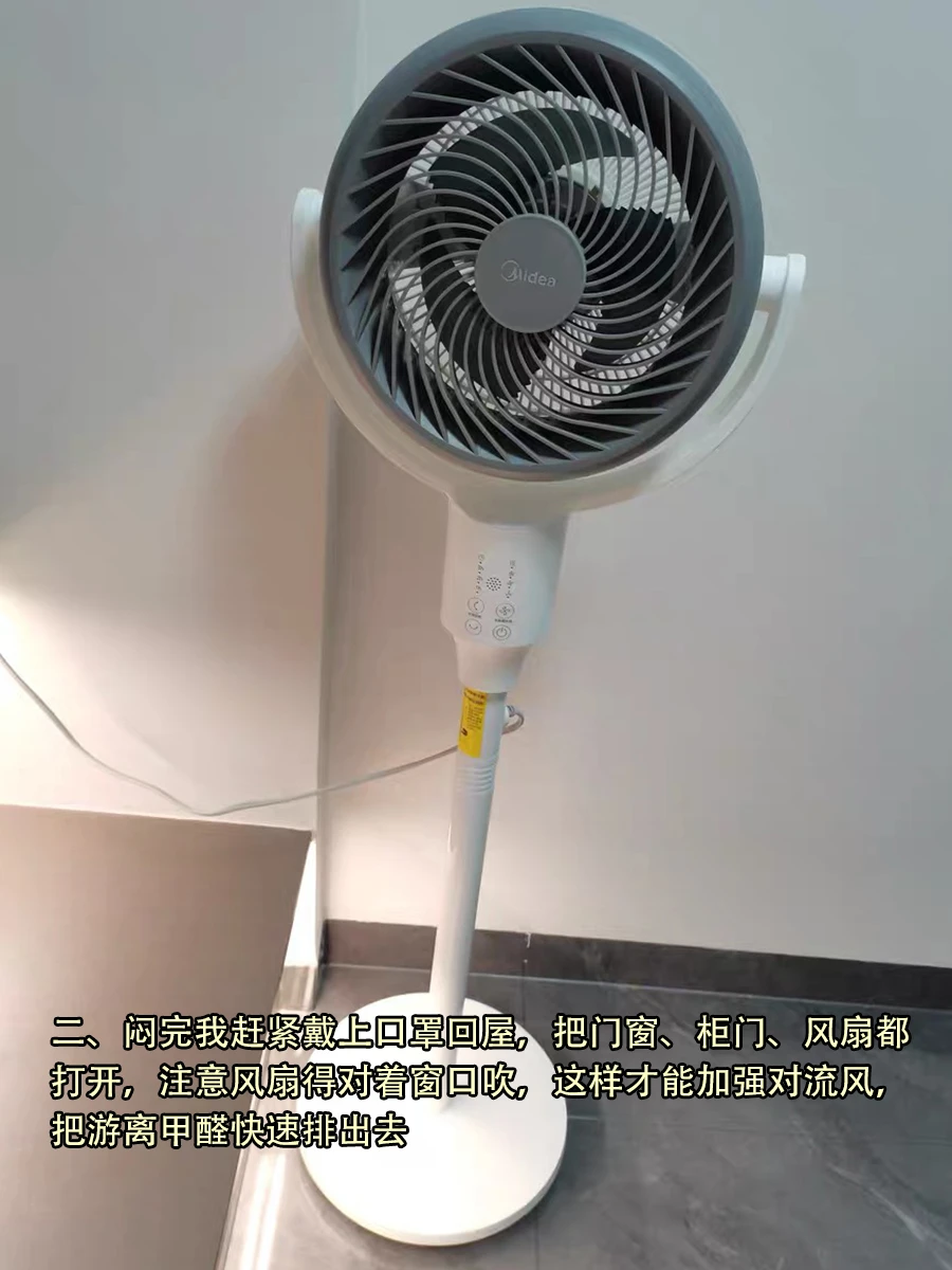 二、闷完我赶紧戴上口罩回屋,把门窗、柜门、风扇都打开,注意风扇得对着窗口吹,这样才能加强对流风,把游离甲醛快速排出去