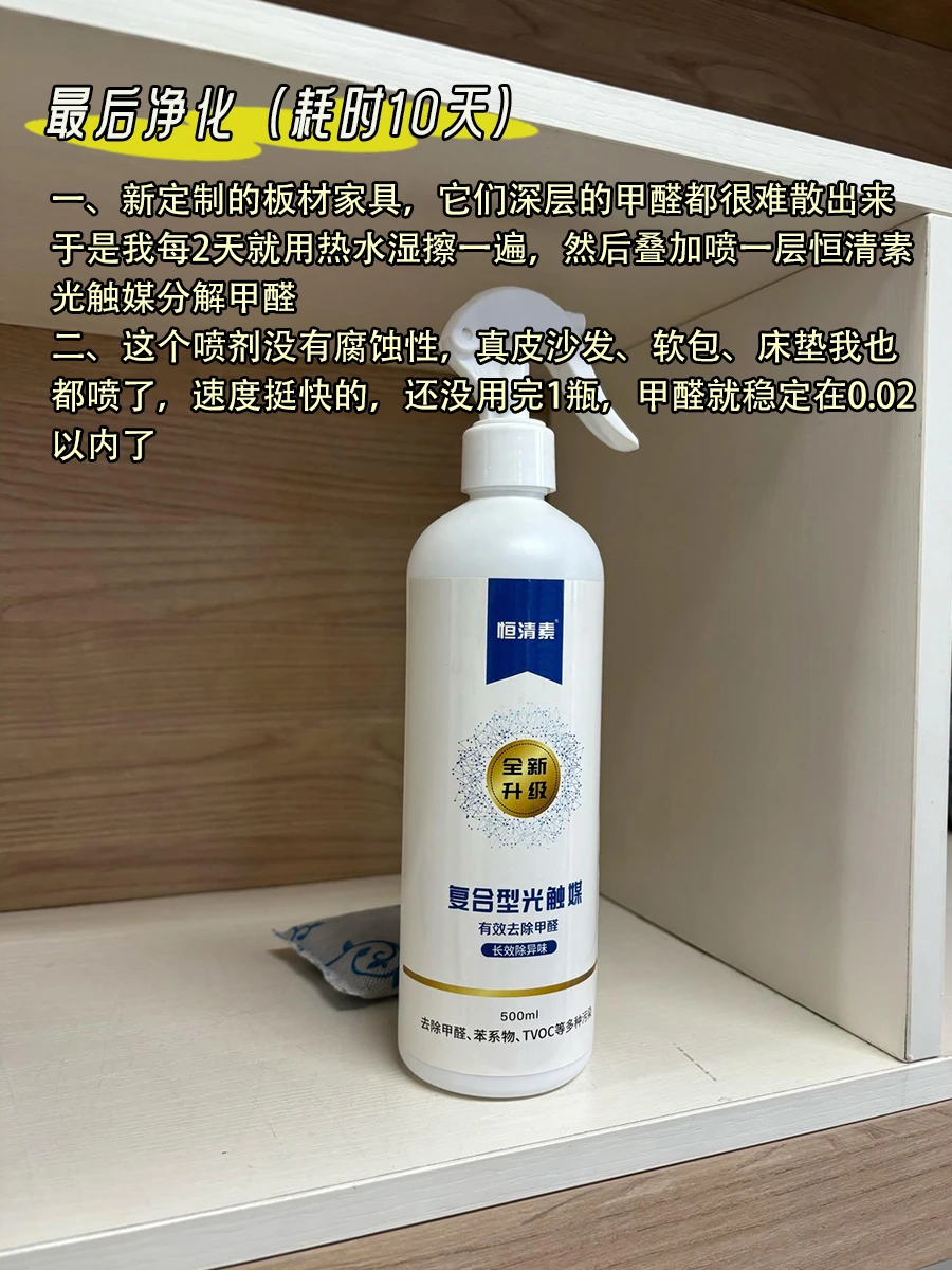 一、新定制的板材家具,它们深层的甲醛都很难散出来,于是我每2天就用热水湿擦一遍,然后叠加喷一层恒清素光触媒分解甲醛