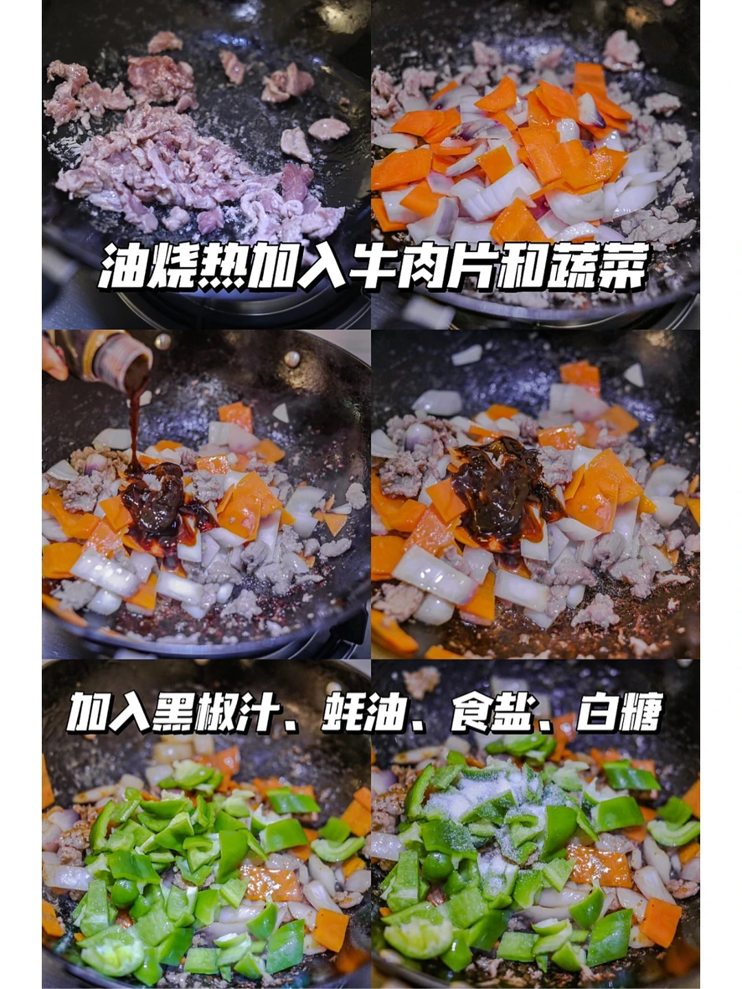 [草莓R]5.锅中烧油,加入蒜末,放入牛肉片炒变色之后加入蔬菜,放入黑胡椒汁、蚝油、白糖少许食盐,让味道充分融合。