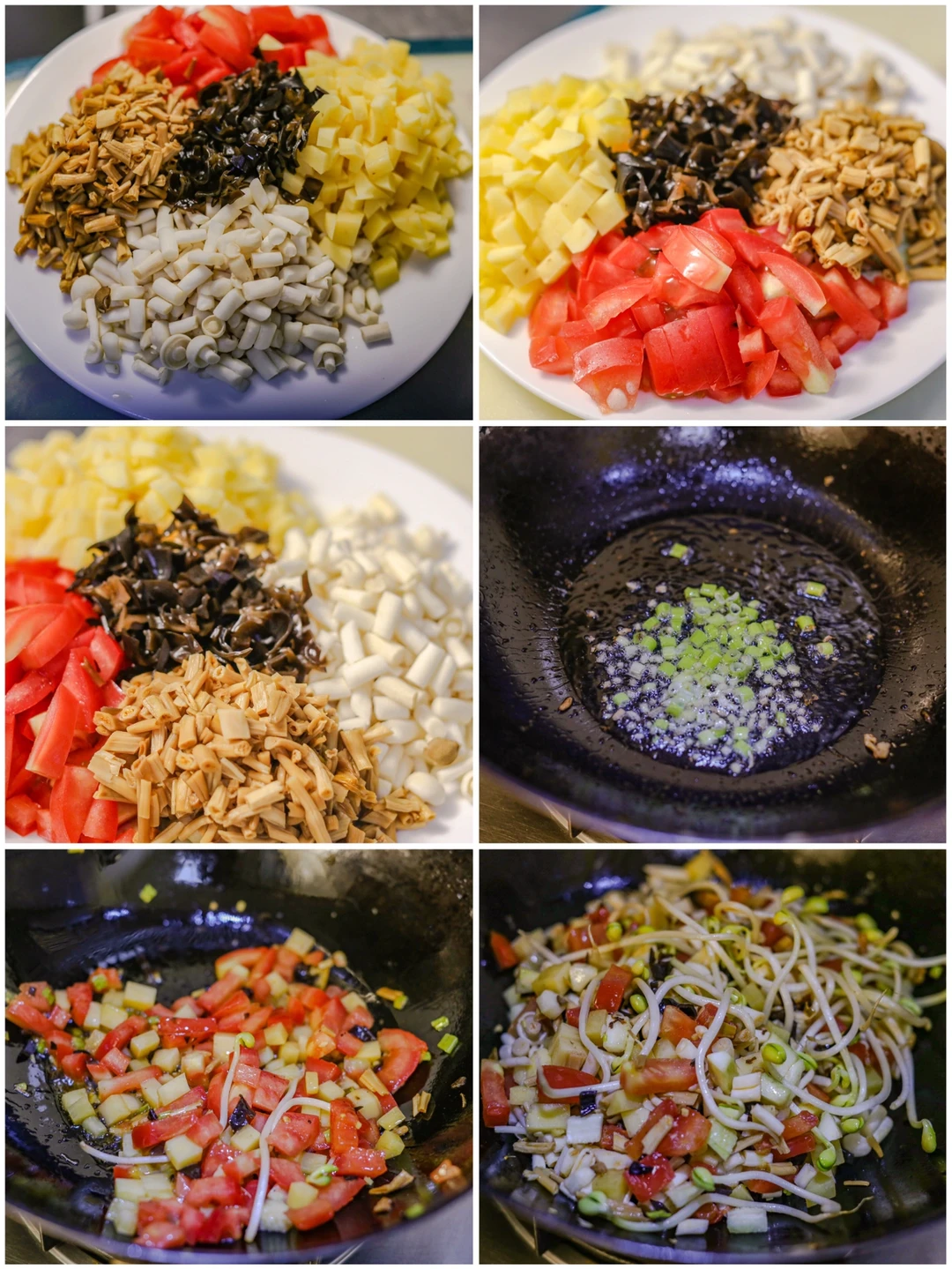 ✨2.锅再次加热,放入适量底油,加入葱姜炝锅,加入西红柿丁,炒出红油之后加入上面所述,除了青菜之外所有的食材。