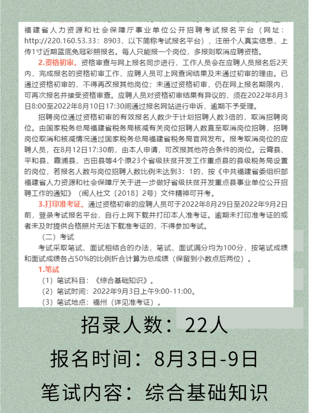 福建税务事业单位公告发布! 招录人数:22人 报名时间:8月3日-9日 报名方式:网上报名 笔试时间:9月3日 笔试内容:综合基础知识