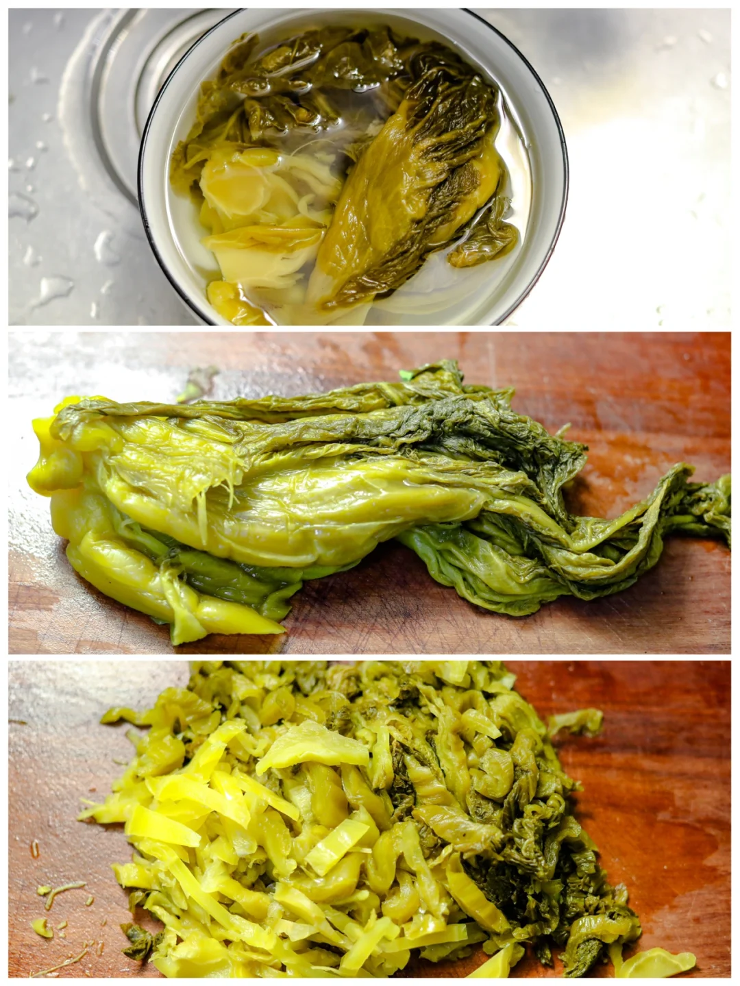 3.酸菜买回来之后,清洗2-3遍之后,如果觉得咸可以稍微泡一会儿。攥干水分之后切成丝儿,待用。