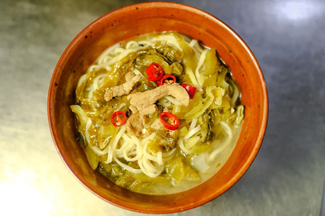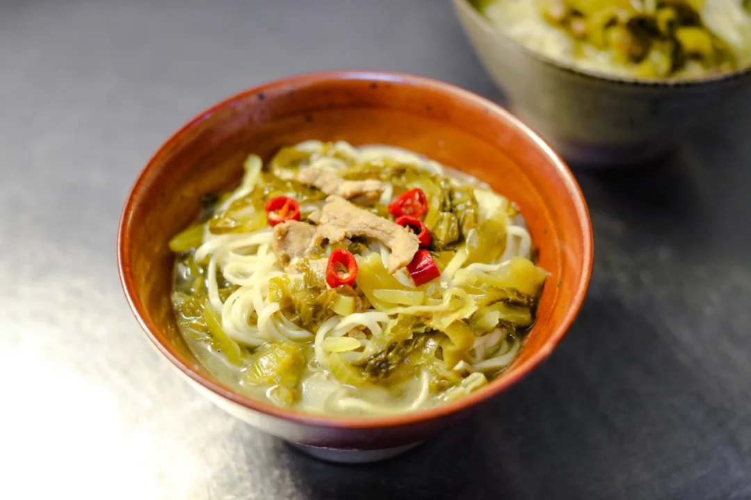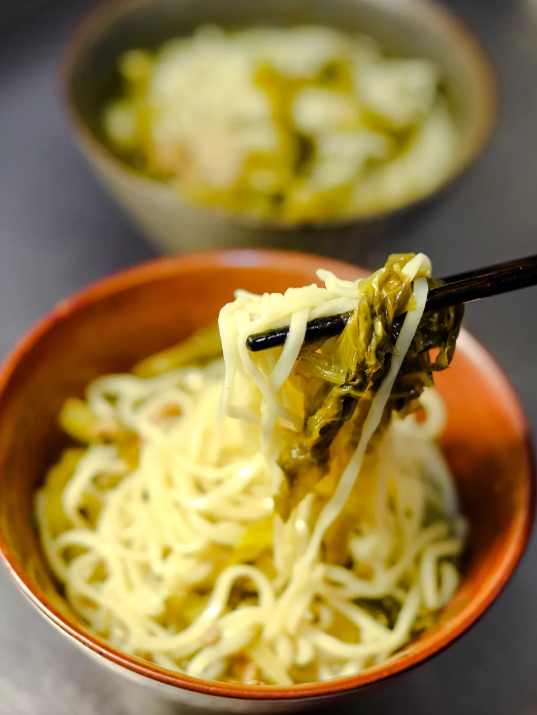 6.面条煮好之后,盛到碗中,浇上酸菜和汤就可以了。